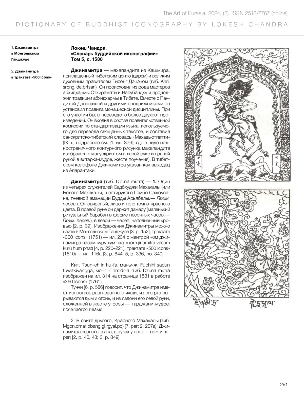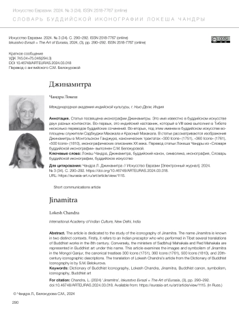 Статья посвящена иконографии Джинамитры. Это имя известно в буддийском искусстве двух разных контекстах. Во-первых, это индийский наставник, который в VIII веке выполнил в Тибете несколько переводов буддийских сочинений. Во-вторых, под этим именем в буддийском искусстве воплощены служители Садбхуджи Махакала и Красный Махакала. В статье рассматриваются изображения Джинамитры в Монгольском Ганджуре, канонических трактатах «300 Icons» (1751), «360 Icons» (1761), «500 Icons» (1810), иконографических описаниях XX века. Перевод статьи Локеша Чандры из «Словаря буддийской иконографии» выполнен С. М. Белокуровой.