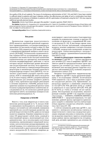 В статье представлен систематический обзор литературы, посвящённый анализу эффективности и безопасности применения агонистов рецепторов глюкагоноподобного пептида-1 (арГПП-1) при хронической сердечной недостаточности (СН) с сохранённой фракцией выброса левого желудочка (ХСНсФВ). Вопрос исследования касался возможностей совместного приёма препаратов из групп ингибиторов натрий-глюкозного котранспортера 2 типа (иНГЛТ2) и арГПП-1. Поиск литературы осуществлялся в системе PubMed. В окончательный анализ вошли 11 исследований, соответствующих изучаемой теме. Согласно анализу, арГПП-1 являются эффективным средством для терапии пациентов с ХСНсФВ, приводя к уменьшению симптомов СН и улучшению качества жизни таких больных. Вопросы одновременного назначения арГПП-1 и иНГЛТ2 достаточно подробно изучены у пациентов с сахарным диабетом 2 типа: продемонстрированы эффективность и безопасность такой комбинации. При отсутствии СД у пациентов с ХСНсФВ оптимизация лечения с использованием класса арГПП-1 требует проведения дополнительных специально спланированных исследований.