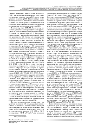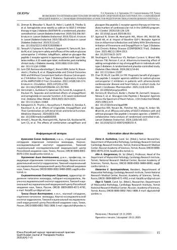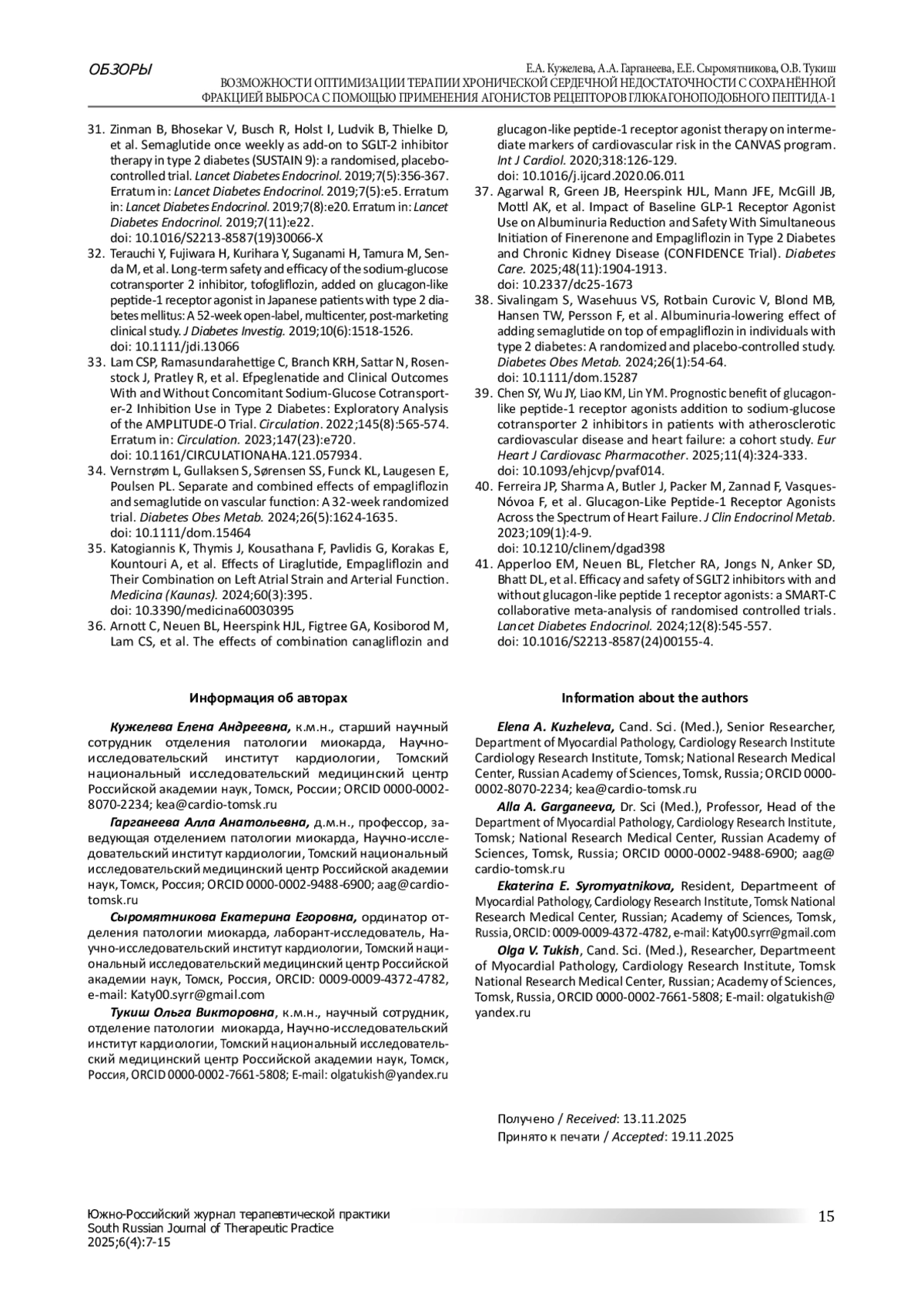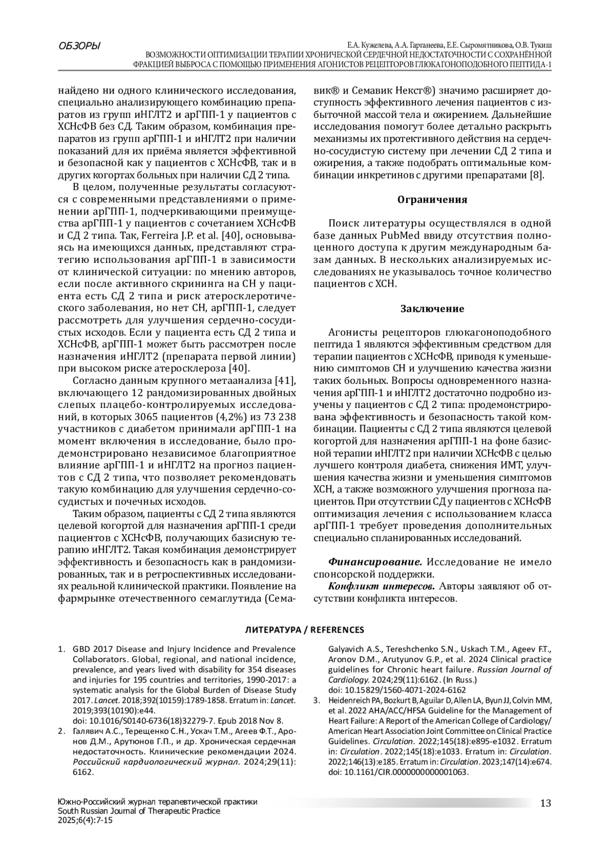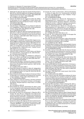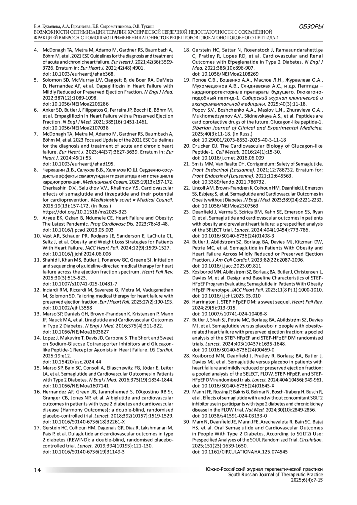 8. Черкашин Д.В., Салухов В.В., Халимов Ю.Ш. Сердечно-сосудистые эффекты семаглутида и тирзепатида и их потенциал в кардиопротекции. Медицинский Совет. 2025;19(13):157-172. DOI: 10.21518/ms2025-323