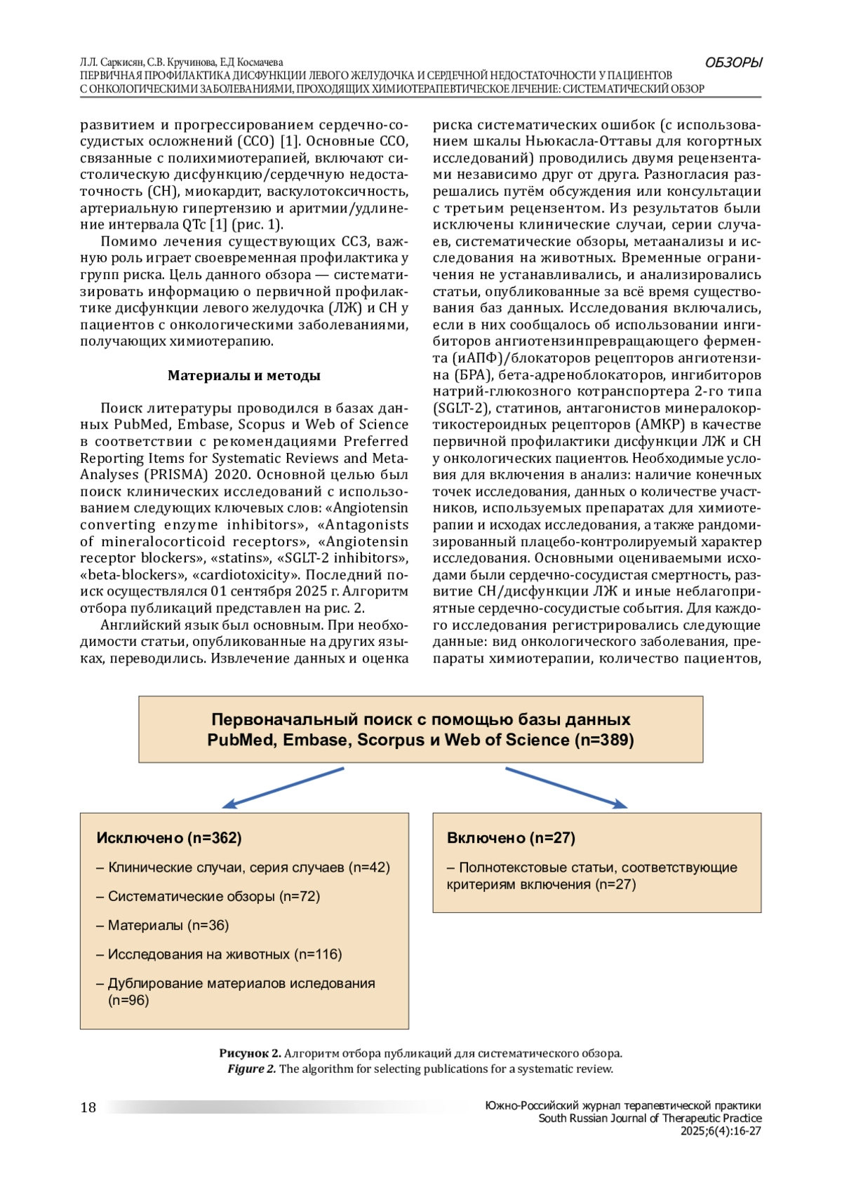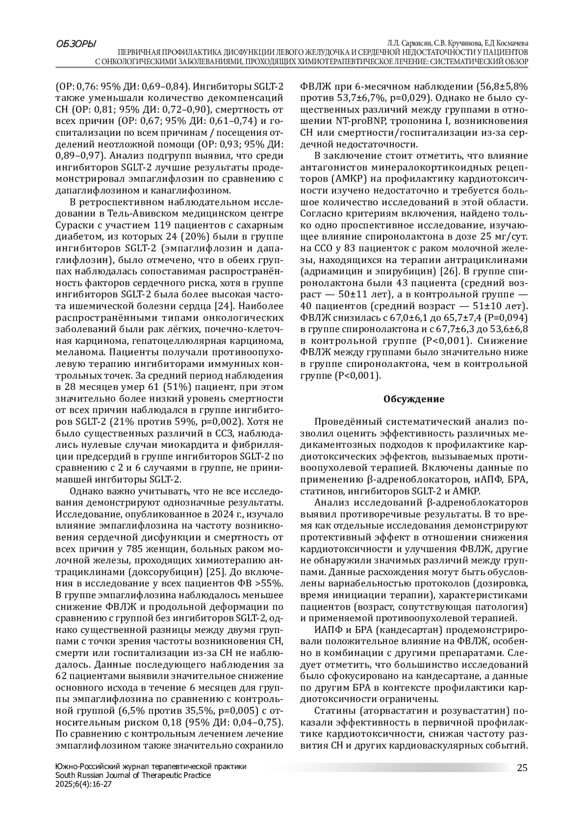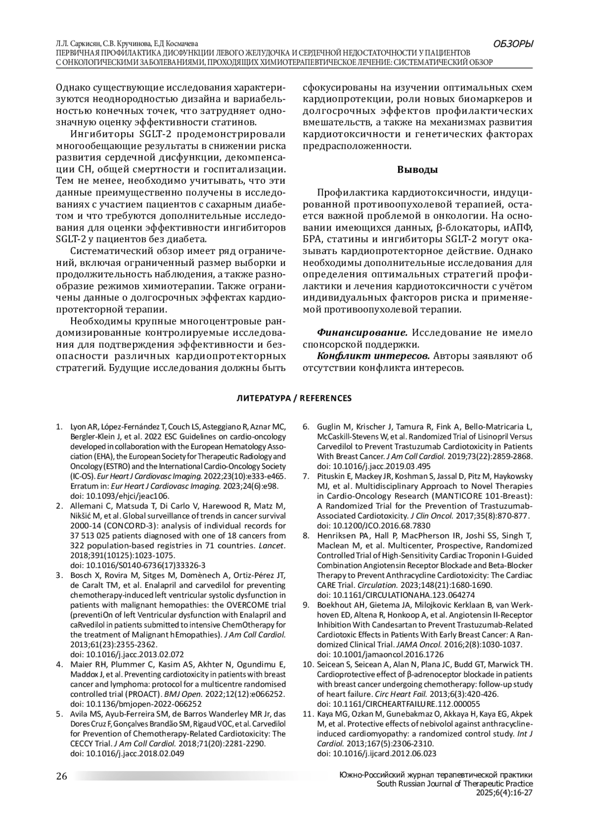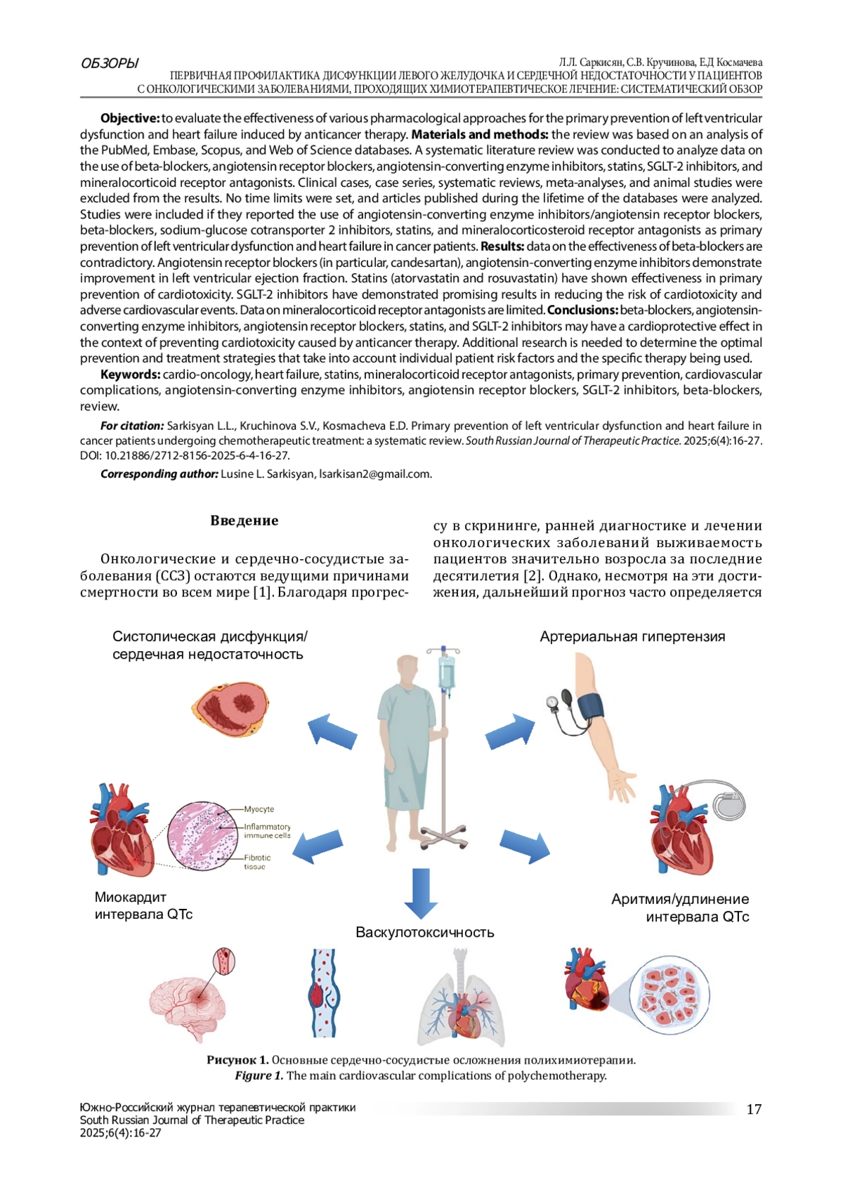 Цель: оценить эффективность различных фармакологических подходов к первичной профилактике дисфункции левого желудочка и сердечной недостаточности, вызванной противоопухолевой терапией. Материалы и методы: обзор выполнен на основе анализа баз данных PubMed, Embase, Scopus и Web of Science. Проведён систематический обзор литературы с анализом данных об использовании бета-блокаторов, блокаторов рецепторов ангиотензина, ингибиторов ангиотензинпревращающего фермента, статинов, ингибиторов SGLT-2 и антагонистов минералокортикоидных рецепторов. Из результатов были исключены клинические случаи, серии случаев, систематические обзоры, метаанализы и исследования на животных. Временные ограничения не устанавливались, и анализировались статьи, опубликованные за все время существования баз данных. Исследования включались, если в них сообщалось об использовании ингибиторов ангиотензинпревращающего фермента/блокаторов рецепторов ангиотензина, бета-адреноблокаторов, ингибиторов натрий-глюкозного котранспортера 2-го типа, статинов, антагонистов минералокортикостероидных рецепторов в качестве первичной профилактики дисфункции левого желудочка и сердечной недостаточности у онкологических пациентов. Необходимые условия для включения в анализ: наличие конечных точек исследования, данных о количестве участников, используемых препаратах для химиотерапии и исходах исследования, а также рандомизированный плацебо-контролируемый характер исследования. Основными оцениваемыми исходами были сердечно-сосудистая смертность, развитие сердечной недостаточности/дисфункции левого желудочка и иные неблагоприятные сердечно-сосудистые события. Результаты: данные об эффективности бета-блокаторов противоречивы. Блокаторы рецепторов ангиотензина (в частности, кандесартан), ингибиторы ангиотензинпревращающего фермента демонстрируют улучшение фракции выброса левого желудочка. Статины (аторвастатин и розувастатин) показали эффективность в первичной профилактике кардиотоксичности. Ингибиторы SGLT-2 продемонстрировали многообещающие результаты в снижении риска кардиотоксичности и неблагоприятных сердечнососудистых событий. Данные об антагонистах минералокортикоидных рецепторов ограничены. Выводы: бета-блокаторы, ингибиторы ангиотензинпревращающего фермента, блокаторы рецепторов ангиотензина, статины и ингибиторы SGLT-2 могут оказывать кардиопротекторный эффект в контексте профилактики кардиотоксичности, вызванной противоопухолевой терапией. Необходимы дополнительные исследования для определения оптимальных стратегий профилактики и лечения, учитывающих индивидуальные факторы риска пациента и применяемую терапию.