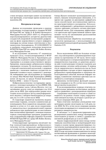 После операций на сердце с применением аппарата искусственного кровообращения (ИК) часто наблюдаются неврологические и поведенческие расстройства, такие как деменция, делирий и послеоперационная когнитивная дисфункция (ПОКД). ПОКД представляет собой распространённую клиническую проблему, влияющую на различные когнитивные аспекты, включая внимание, память, исполнительные функции и скорость обработки информации [1]. Группой риска по развитию ПОКД в основном являются пожилые пациенты, у которых распространённость ПОКД может достигать 40% в первые месяцы после хирургического вмешательства. Также данные пациенты имеют повышенный риск развития долгосрочных когнитивных нарушений после операции [2].