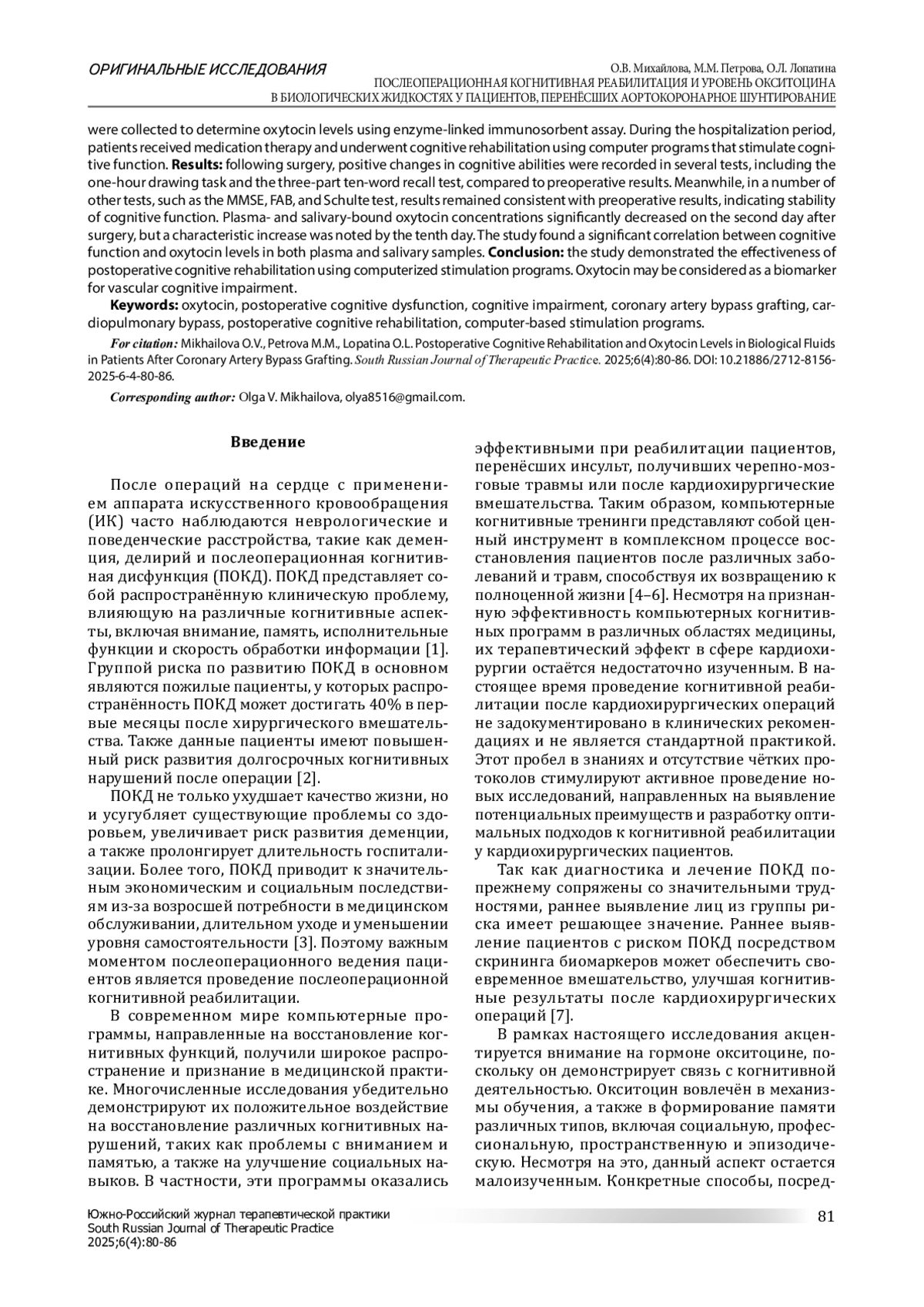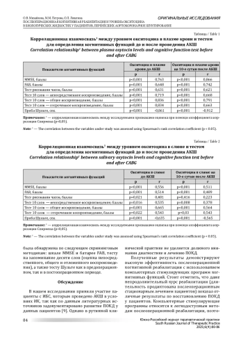 Цель: оценить влияние оперативного вмешательства на колебания уровня окситоцина в сыворотке крови и слюне, а также взаимосвязь между уровнем когнитивной дисфункции и окситоцином. Провести оценку эффективности реабилитации когнитивной дисфункции пациентов с использованием стимулирующих компьютерных программ после проведения аортокоронарного шунтирования. Материалы и методы: исследование включало 47 мужчин, госпитализированных для планового аортокоронарного шунтирования в условиях искусственного кровообращения. Когнитивные функции оценивались до операции и на 10-й день послеоперационного периода с использованием скрининговых тестов. Определение уровня окситоцина осуществлялось с помощью метода иммуноферментного анализа. В госпитальном периоде пациенты получали медикаментозную терапию и проходили курс когнитивной реабилитации с использованием компьютерных стимулирующих программ. Результаты: в послеоперационном периоде наблюдалось улучшение когнитивных функций по ряду тестов, таких как рисование часов и три этапа теста на запоминание 10 слов, по сравнению с предоперационным уровнем. В некоторых тестах, например, MMSE, FAB и пробе Шульте, показатели оставались на уровне дооперационной оценки, свидетельствуя о сохранении когнитивных способностей. Отмечалось значимое снижение уровня окситоцина, начиная со 2-х суток послеоперационного периода, и статистически значимый рост к 10-му дню госпитализации. Выявлено наличие корреляционной связи между показателями биомаркера окситоцина и наличием когнитивного дефицита. Особенно ярко эта связь проявляется при использовании скрининговых тестов MMSE, FAB, теста на запоминание 10 слов и пробы Шульте. Заключение: по результатам исследования доказана эффективность послеоперационной когнитивной реабилитации с использованием компьютерных стимулирующих программ. Возможно рассмотрение окситоцина как биомаркера сосудистых когнитивных нарушений.