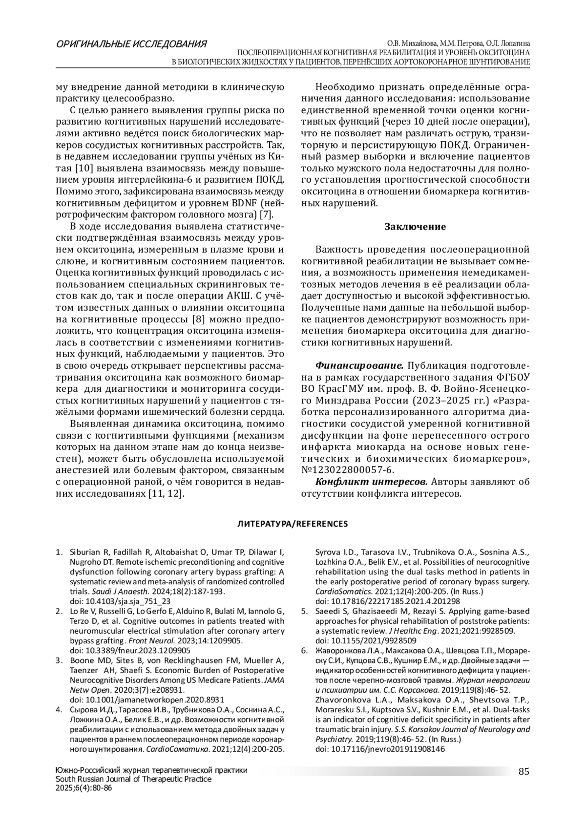 4. Сырова И.Д., Тарасова И.В., Трубникова О.А., Соснина А.С., Ложкина О.А., Белик Е.В., и др. Возможности когнитивной реабилитации с использованием метода двойных задач у пациентов в раннем послеоперационном периоде коронарного шунтирования. CardioСоматика. 2021;12(4):200-205. DOI: 10.17816/22217185.2021.4.201298