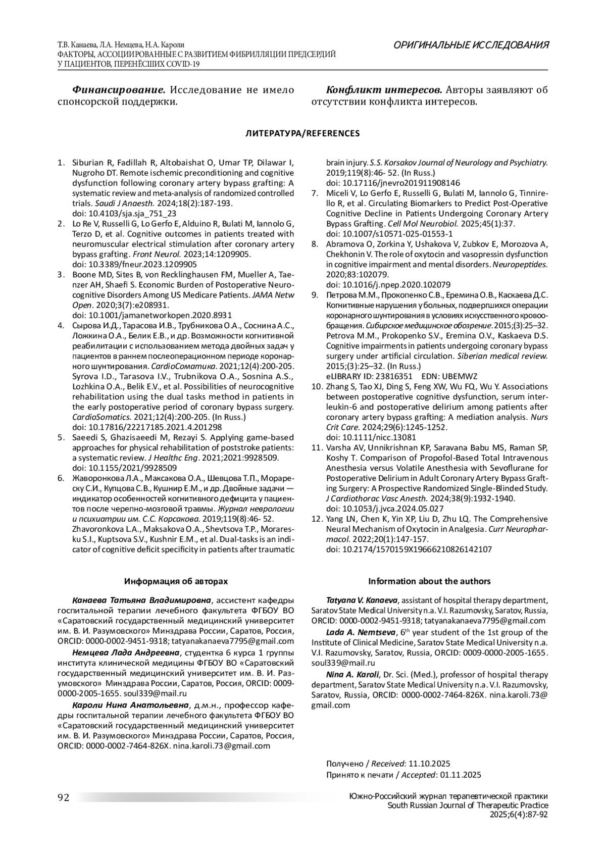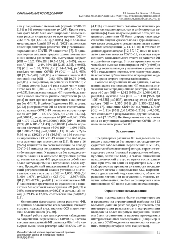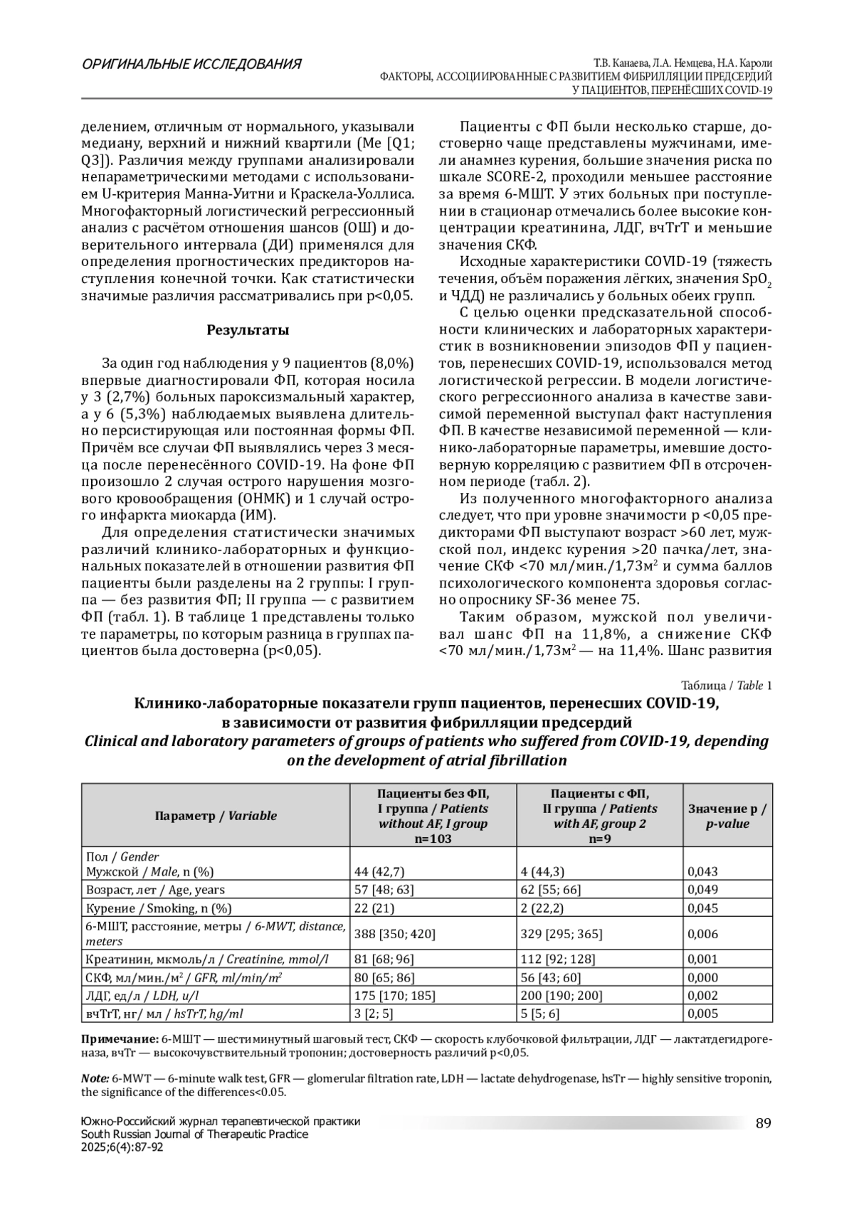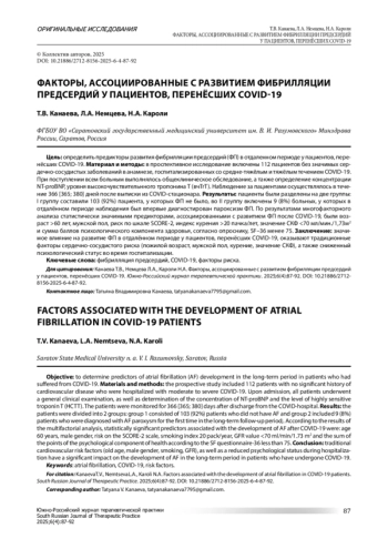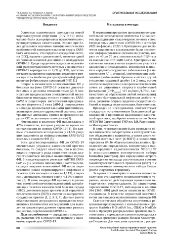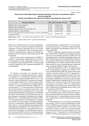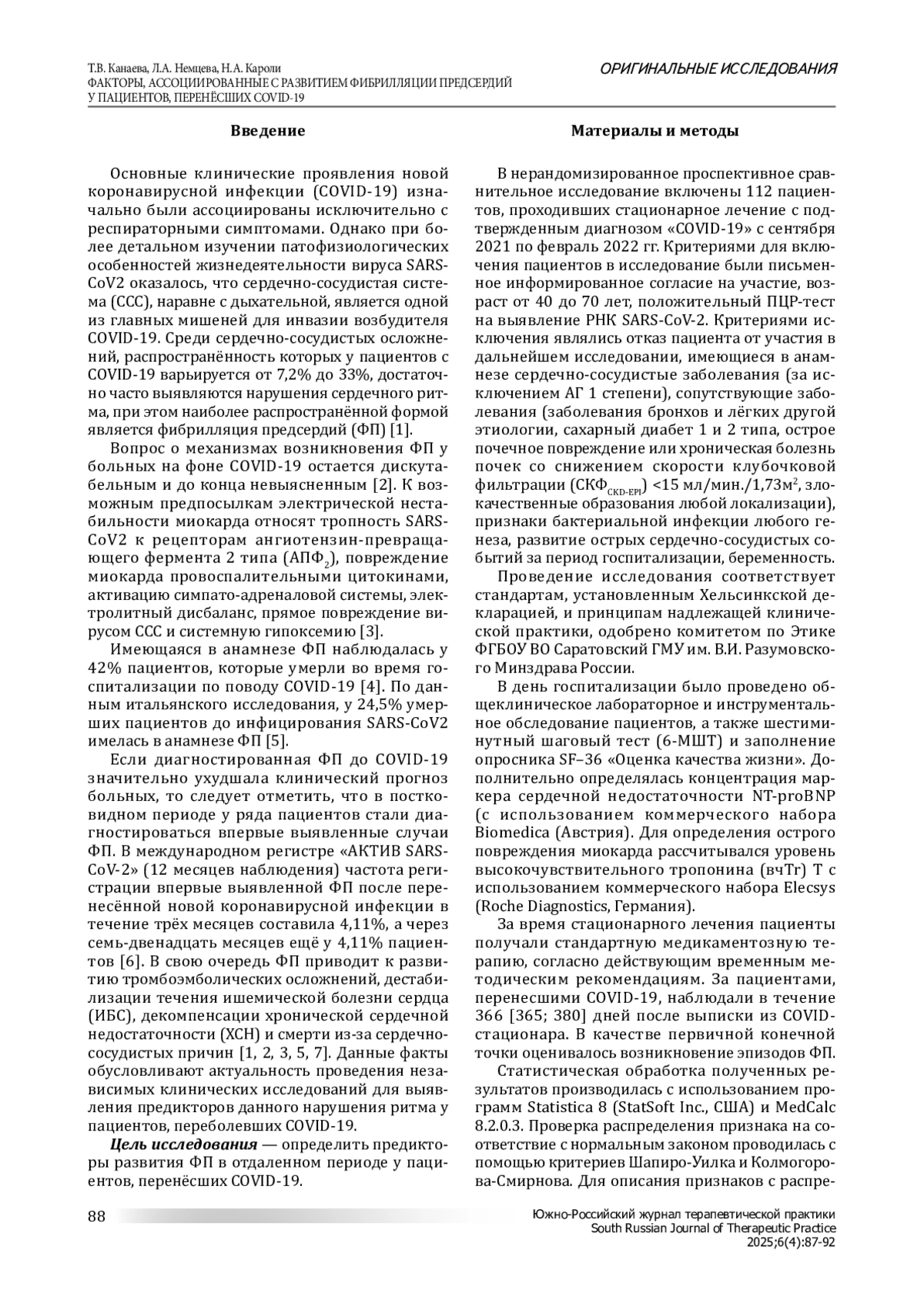 Цель: определить предикторы развития фибрилляции предсердий (ФП) в отдаленном периоде у пациентов, перенёсших COVID-19. Материал и методы: в проспективное исследование включены 112 пациентов без значимых сердечно-сосудистых заболеваний в анамнезе, госпитализированных со средне-тяжёлым и тяжёлым течением COVID-19. При поступлении всем больным выполнялось общеклиническое обследование, а также определение концентрации NT-proBNP, уровня высокочувствительнного тропонина Т (вчTrT). Наблюдение за пациентами осуществлялось в течение 366 [365; 380] дней после выписки из COVID-стационара. Результаты: пациенты были разделены на две группы: I группу составили 103 (92%) пациента, у которых ФП не было, во II группу включены 9 (8%) больных, у которых в отдалённом периоде наблюдения был впервые диагностирован пароксизм ФП. По результатами многофакторного анализа статистически значимыми предикторами, ассоциированными с развитием ФП после COVID-19, были возраст >60 лет, мужской пол, риск по шкале SCORE-2, индекс курения >20 пачка/лет, значение СКФ <70 мл/мин./1,73м2 и сумма баллов психологического компонента здоровья, согласно опроснику, SF–36 менее 75. Заключение: значимое влияние на развитие ФП в отдалённом периоде у пациентов, перенёсших COVID-19, оказывают традиционные факторы сердечно-сосудистого риска (пожилой возраст, мужской пол, курение, значение СКФ), а также сниженный психологический статус во время госпитализации.