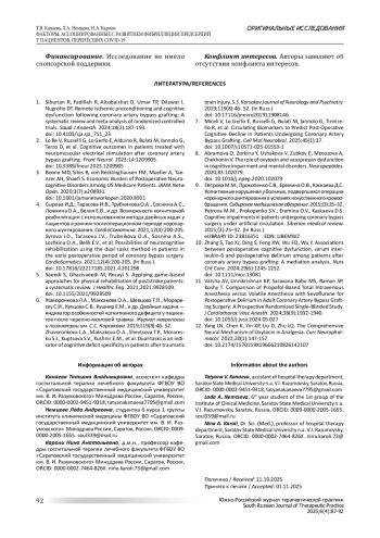 4. Сырова И.Д., Тарасова И.В., Трубникова О.А., Соснина А.С., Ложкина О.А., Белик Е.В., и др. Возможности когнитивной реабилитации с использованием метода двойных задач у пациентов в раннем послеоперационном периоде коронарного шунтирования. CardioСоматика. 2021;12(4):200-205. DOI: 10.17816/22217185.2021.4.201298