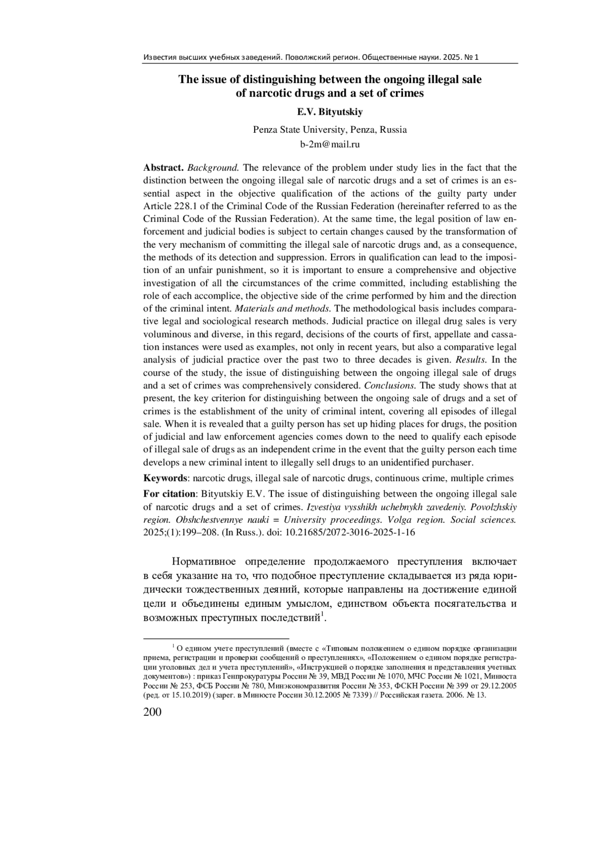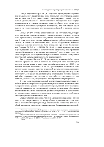 Актуальность и цели. Актуальность исследуемой проблемы заключается в том, что разграничение продолжаемого незаконного сбыта наркотических средств и совокупности преступлений является существенным аспектом в объективной квалификации действий виновного лица по ст. 228.1 Уголовного кодекса Российской Федерации. Вместе с тем правовая позиция правоприменительных и судебных органов подвержена определенным изменениям, вызванным трансформацией самого механизма совершения незаконного сбыта наркотических средств и, как следствие, методик его выявления и пресечения. Ошибки в квалификации могут привести к назначению несправедливого наказания, поэтому важно обеспечить всестороннее и объективное расследование всех обстоятельств совершенного преступления, в том числе установить роль каждого соучастника, выполняемую им, объективную сторону преступления и направленность преступного умысла.