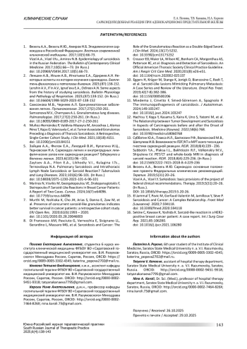 2. Леншин А.В., Ильин А.В., Игнатьева Е.А., Одиреев А.Н. Некоторые аспекты из истории изучения саркоидоза. Бюллетень физиологии и патологии дыхания. 2023;(87):138-152. DOI: 10.36604/1998-5029-2023-87-138-152