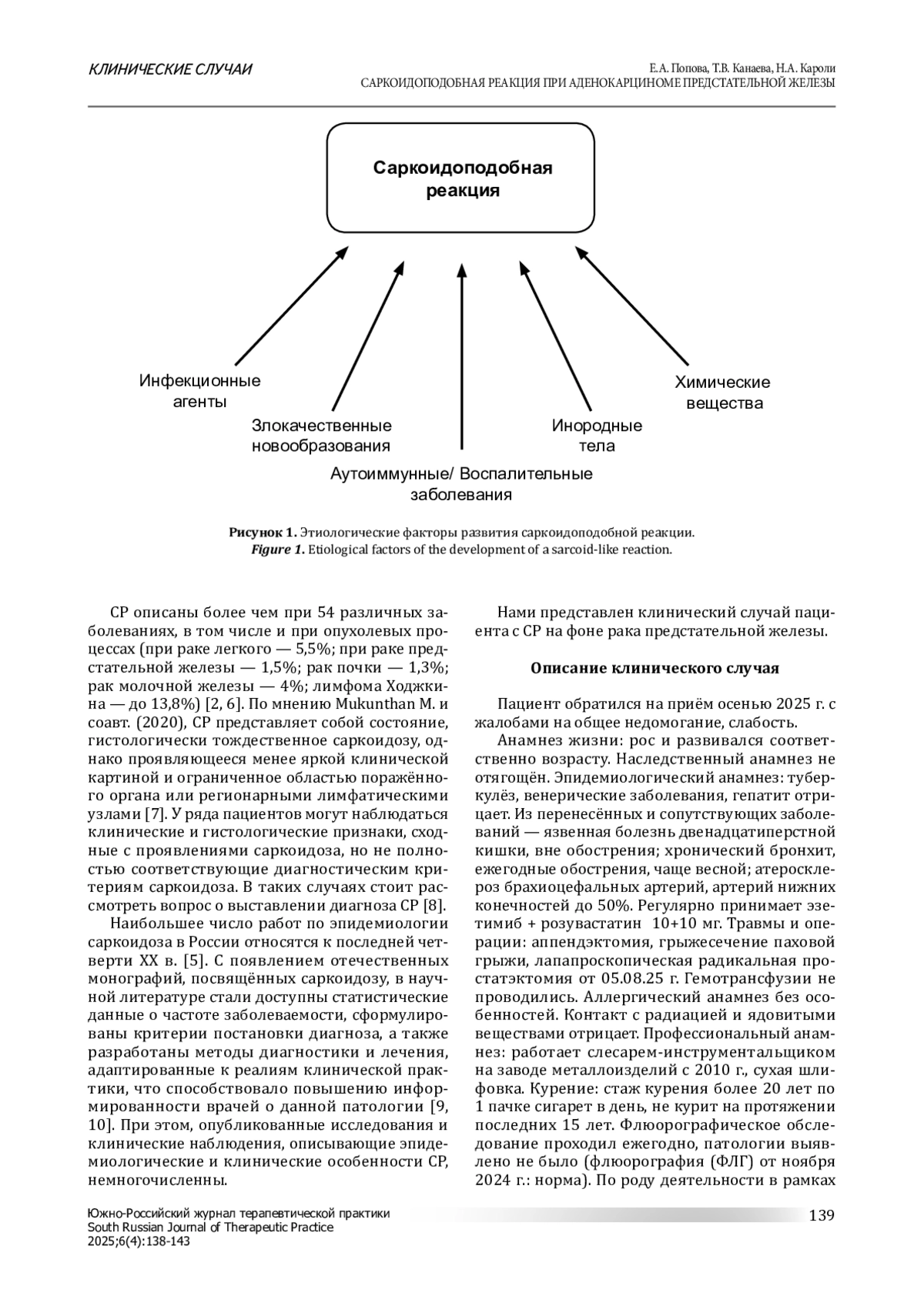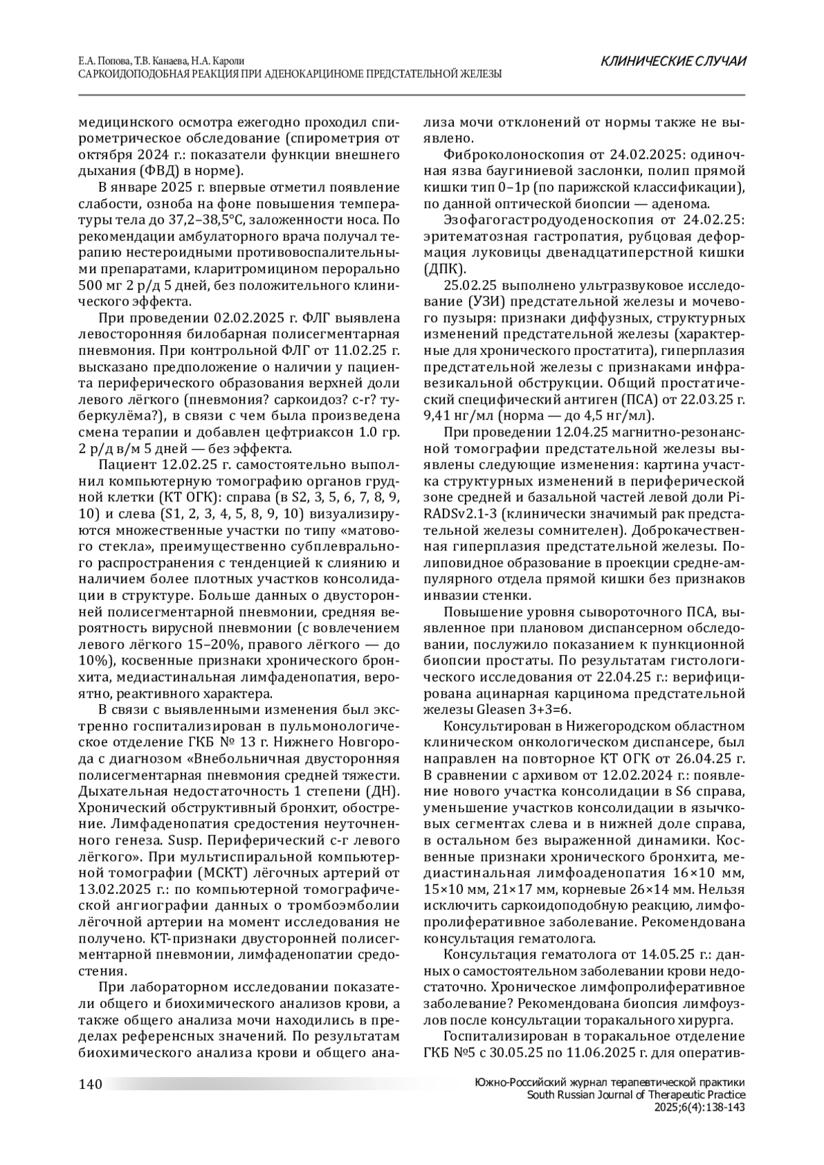Гранулематозные болезни — это гетерогенная группа заболеваний различной этиологии, проявляющихся разнообразными клиническими синдромами и вариантами тканевых изменений, неоднородной чувствительностью к терапии и преобладанием общего доминирующего гистологического признака (наличия гранулем, определяющих клинико-морфологическую сущность каждой болезни). Среди гранулематозных заболеваний особое место занимает саркоидоз как одна из наиболее распространённых и клинических значимых патологий данной группы. Приводится клиническое наблюдение редкой коморбидности — саркоидоподобной реакции и рака предстательной железы у мужчины 61 года, подтверждённой при исследовании биопсийного материала.