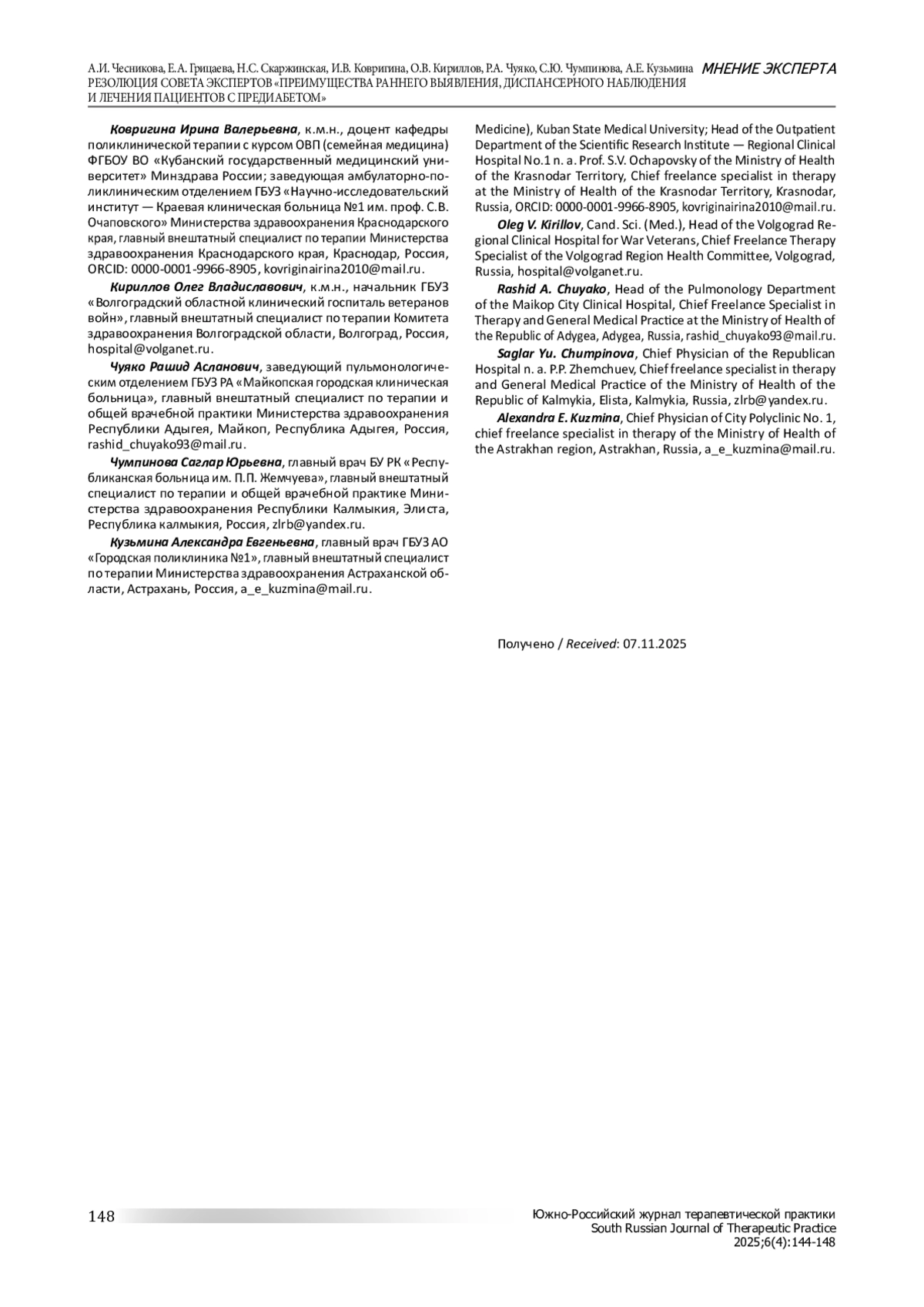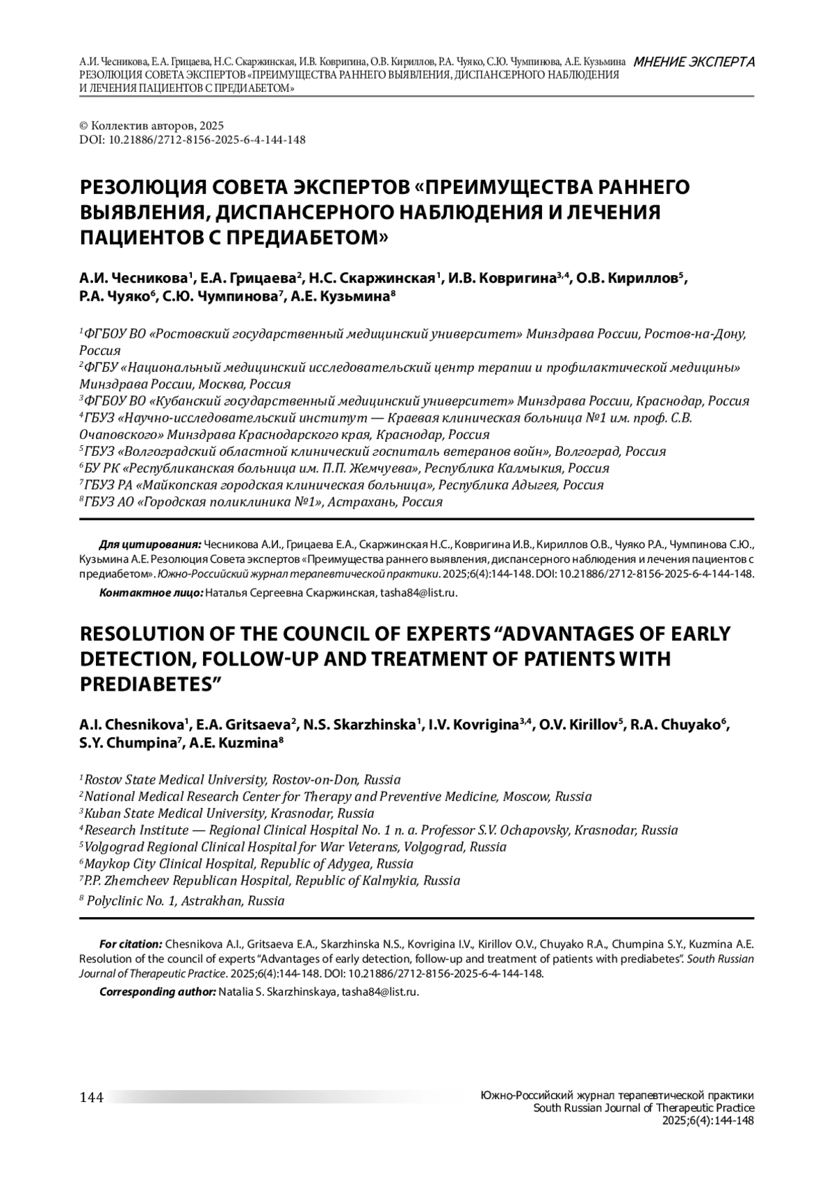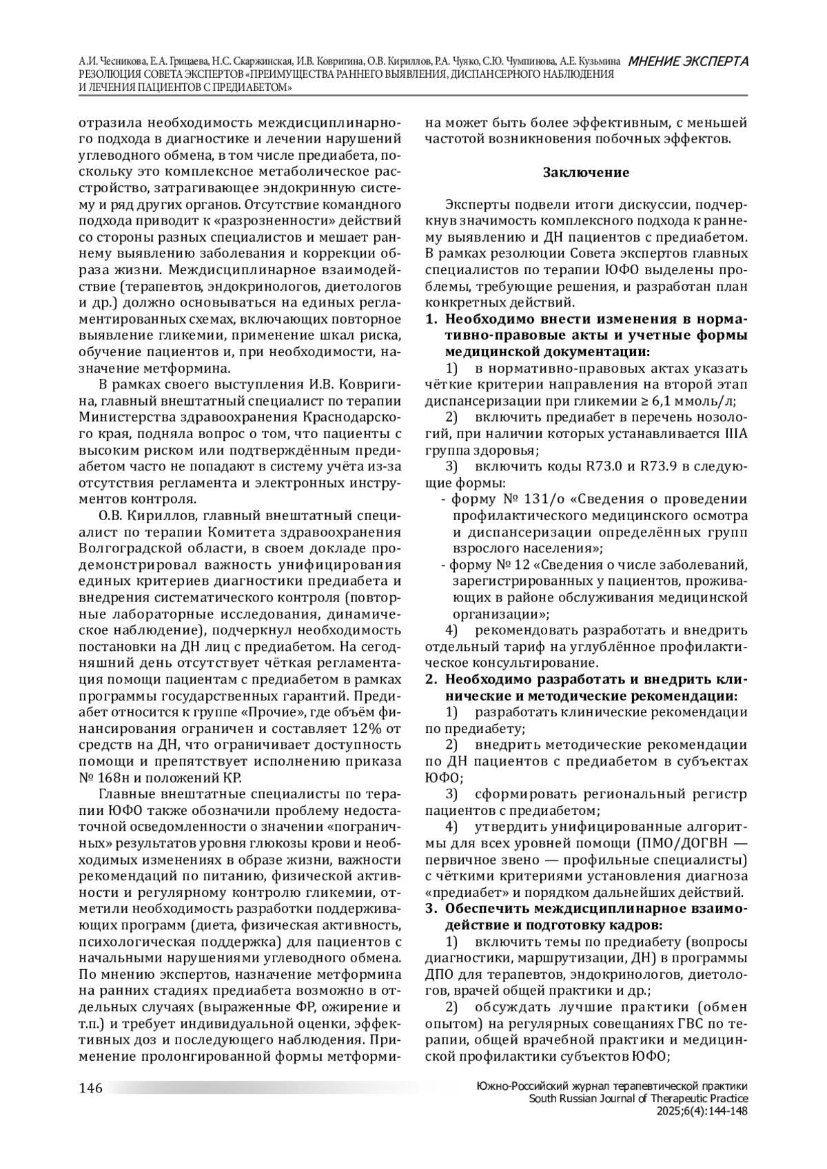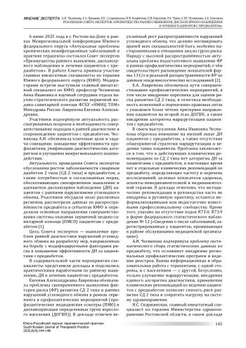 6 июня 2025 года в г. Ростове-на-Дону в рамках Межрегиональной конференции Южного федерального округа «Актуальные проблемы хронических неинфекционных заболеваний в практике терапевта» состоялся Совет экспертов «Преимущества раннего выявления, диспансерного наблюдения и лечения пациентов с предиабетом». В работе Совета приняли участие главные внештатные специалисты по терапии Южного федерального округа (ЮФО). Модераторами встречи выступили главный внештатный специалист по ЮФО, профессор Чесникова Анна Ивановна и научный сотрудник отдела научно-стратегического развития первичной медико-санитарной помощи ФГБУ «НМИЦ ТПМ» Минздрава России Лавренова Евгения Александровна.