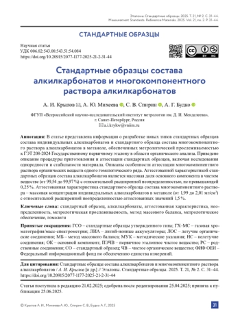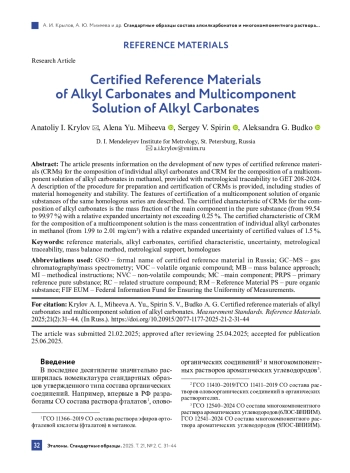 В статье представлена информация о разработке новых типов стандартных образцов состава индивидуальных алкилкарбонатов и стандартного образца состава многокомпонентного раствора алкилкарбонатов в метаноле, обеспеченных метрологической прослеживаемостью к ГЭТ 208‑2024 Государственному первичному эталону в области органического анализа. Приведено описание процедуры приготовления и аттестации стандартных образцов, включая исследования однородности и стабильности материала. Описаны особенности аттестации многокомпонентного раствора органических веществ одного гомологического ряда. Аттестованной характеристикой стандартных образцов состава алкилкарбонатов является массовая доля основного компонента в чистом веществе (от 99,54 до 99,97 %) с относительной расширенной неопределенностью, не превышающей 0,25 %. Аттестованная характеристика стандартного образца состава многокомпонентного раствора – массовая концентрация индивидуальных алкилкарбонатов в метаноле (от 1,99 до 2,01 мг/см3) с относительной расширенной неопределенностью аттестованных значений 1,5 %.