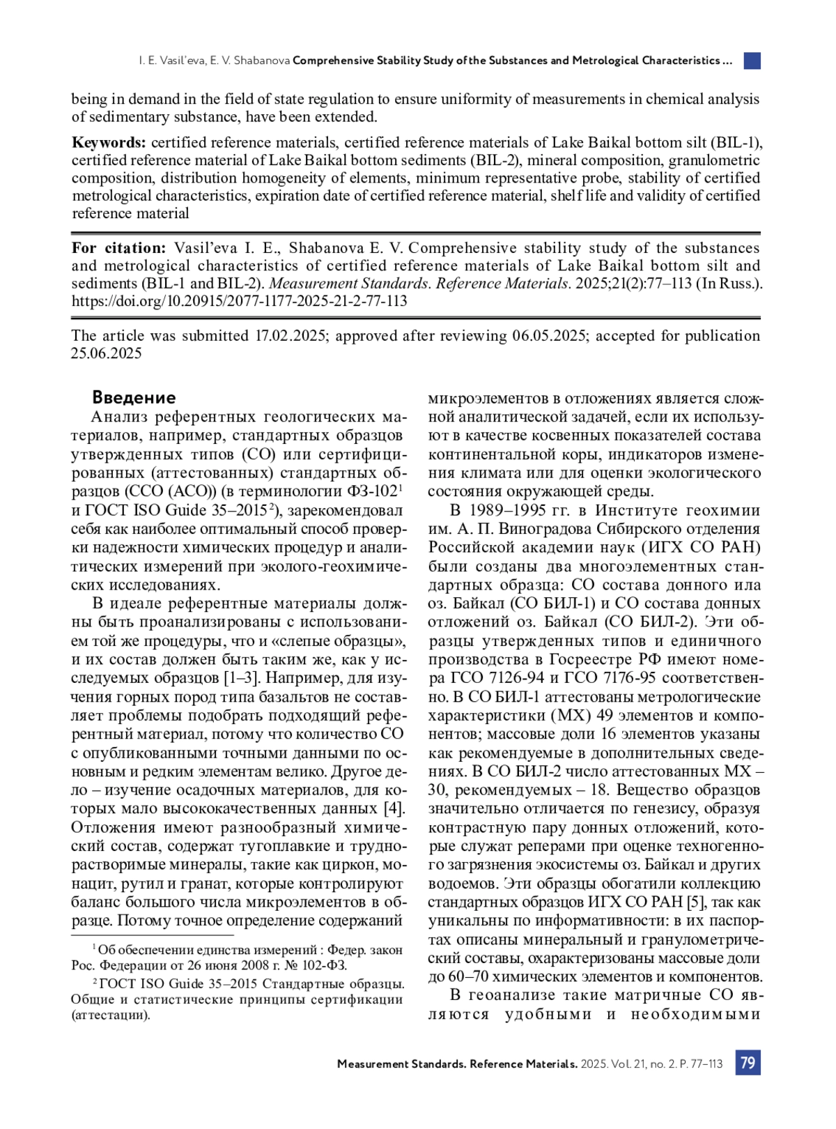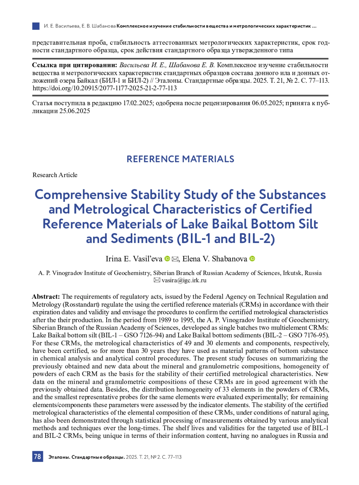 Требования установленных Федеральным агентством по техническому регулированию и метрологии (Росстандарт) нормативных документов регламентируют применение стандартных образцов утвержденных типов в соответствии с их сроками годности и действия, а после их изготовления предусматривают процедуры подтверждения их аттестованных метрологических характеристик. В 1989–1995 гг. в Институте геохимии им. А. П. Виноградова Сибирского отделения Российской академии наук были разработаны единичные партии двух многоэлементных стандартных образцов утвержденных типов: донный ил озера Байкал (СО БИЛ‑1 – ГСО 7126-94) и донные отложения озера Байкал (СО БИЛ‑2 – ГСО 7176-95). Вещество этих образцов характеризуют аттестованные метрологические характеристики 49 и 30 элементов и компонентов соответственно. Более 30 лет эти образцы находят применение в качестве материальных моделей донного вещества в процедурах химического анализа и аналитического контроля.