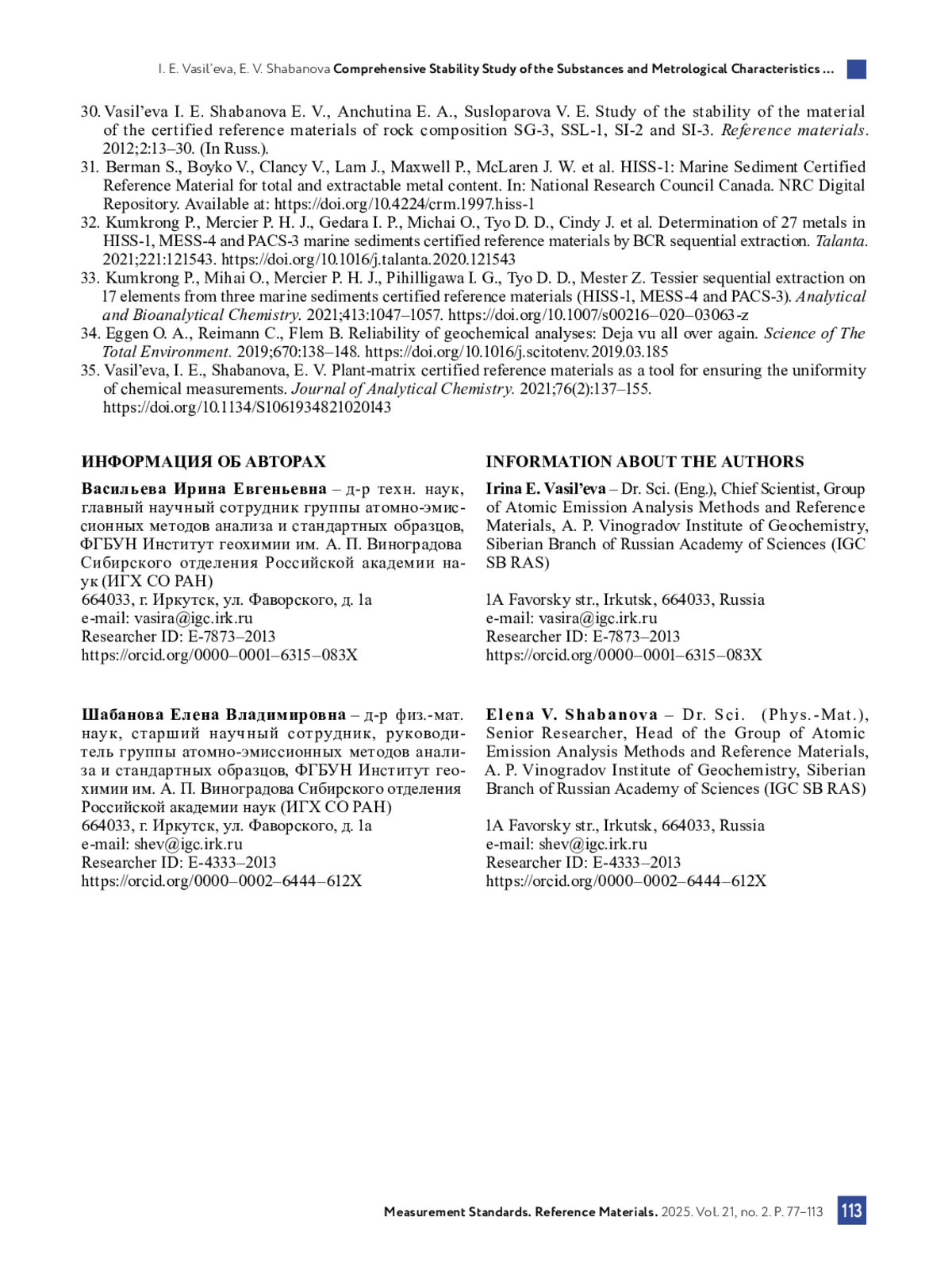 35. Васильева И.Е., Шабанова Е.В. Стандартные образцы растительных материалов - инструмент обеспечения единства химических измерений // Журнал аналитической химии. 2021. Т. 76. № 2. С. 99-123. DOI: 10.31857/S0044450221020146