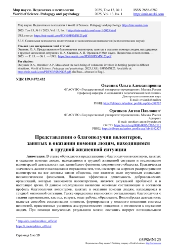 В статье обсуждаются представления о благополучии волонтеров, занятых в оказании помощи людям, находящимся в трудной жизненной ситуации и исследование волонтерской деятельности как важнейшего феномена современного общества. Практическая значимость данного исследования определена тем, что, несмотря на широкое распространение волонтерства на все аспекты жизни общества, оно является мало изученным социально-психологическим феноменом. Насколько эффективна деятельность добровольческих организаций, которые занимаются волонтерством, является актуальной проблемой и в настоящее время. В данном исследовании выявлены основные составляющие и составлен профиль благополучия волонтеров, занятых в оказании помощи людям, находящимся в трудной жизненной ситуации. Также определены взаимосвязи составляющих благополучия с такими переменными, как пол, возраст, опыт работы, образование. Волонтёрская деятельность является способом социализации личности, формирования у молодого поколения системы ценностей, нравственных установок альтруистического поведения и готовности к служению людям. При помощи полученных результатов можно составить портрет потенциального волонтера и разработать комплекс мероприятий по привлечению к волонтерской деятельность людей разного возраста. При этом для каждой возрастной аудитории рекомендуется использовать свои способы привлечения к данного вида деятельности, ориентируясь на те аспекты благополучия, которые были выявлены в процессе исследования. Так же, в процессе исследования было выявлено, что на представления волонтеров о благополучии влияет и опыт занятия волонтерской деятельностью, в данном случае, по оказанию помощи людям, находящимся в трудной жизненной ситуации.