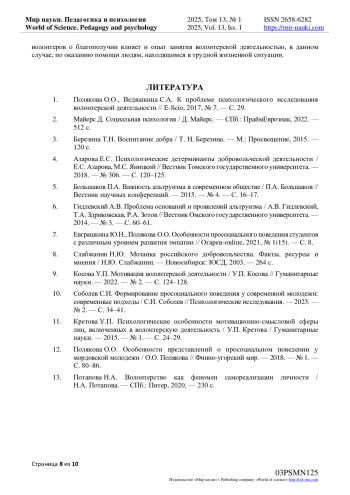 1. Полякова О.О., Ведяшкина С.А. К проблеме психологического исследования волонтерской деятельности // E-Scio, 2017, № 7. - С. 29. EDN: ZIEFTN
