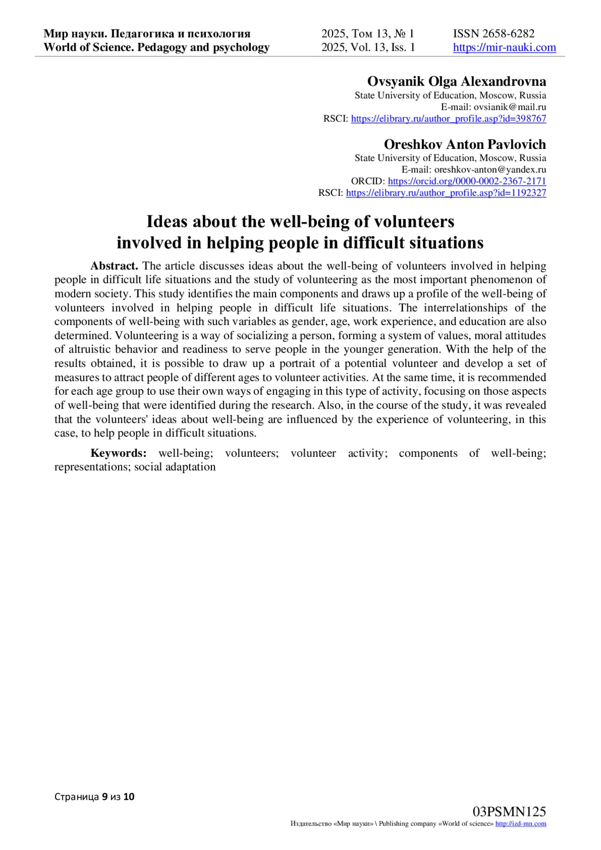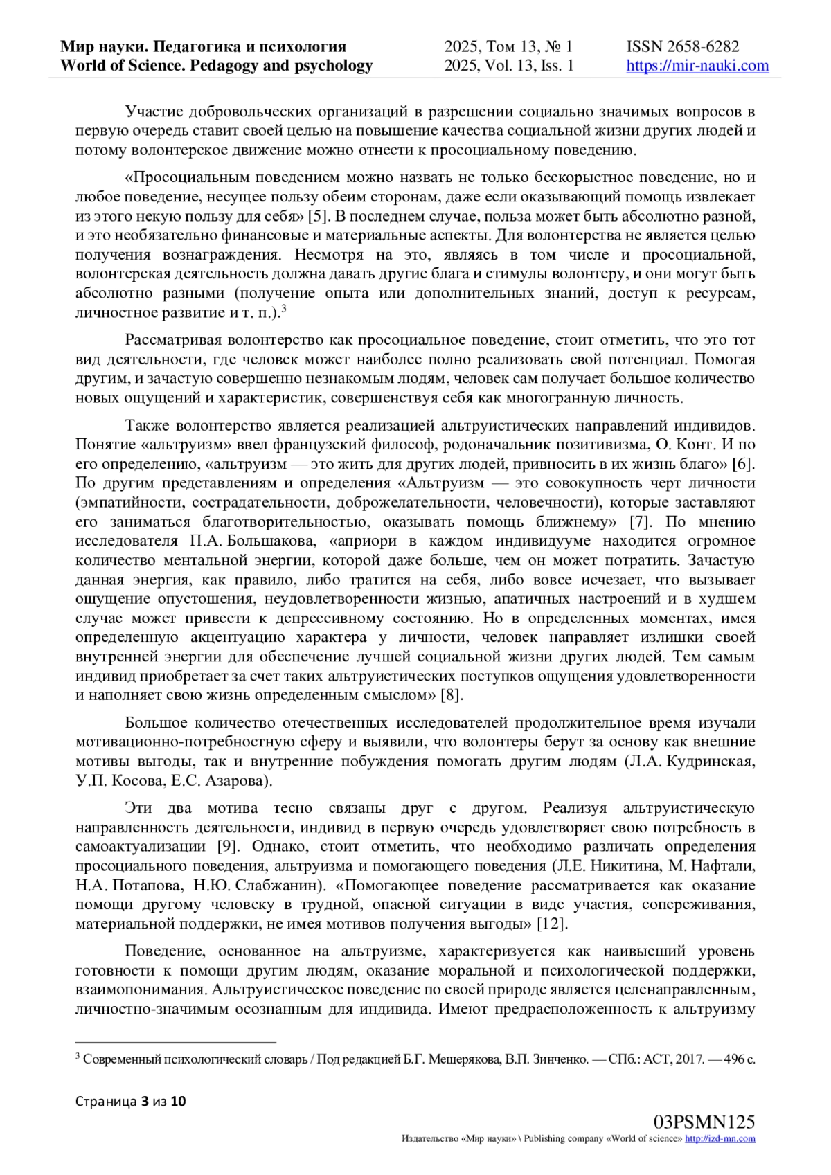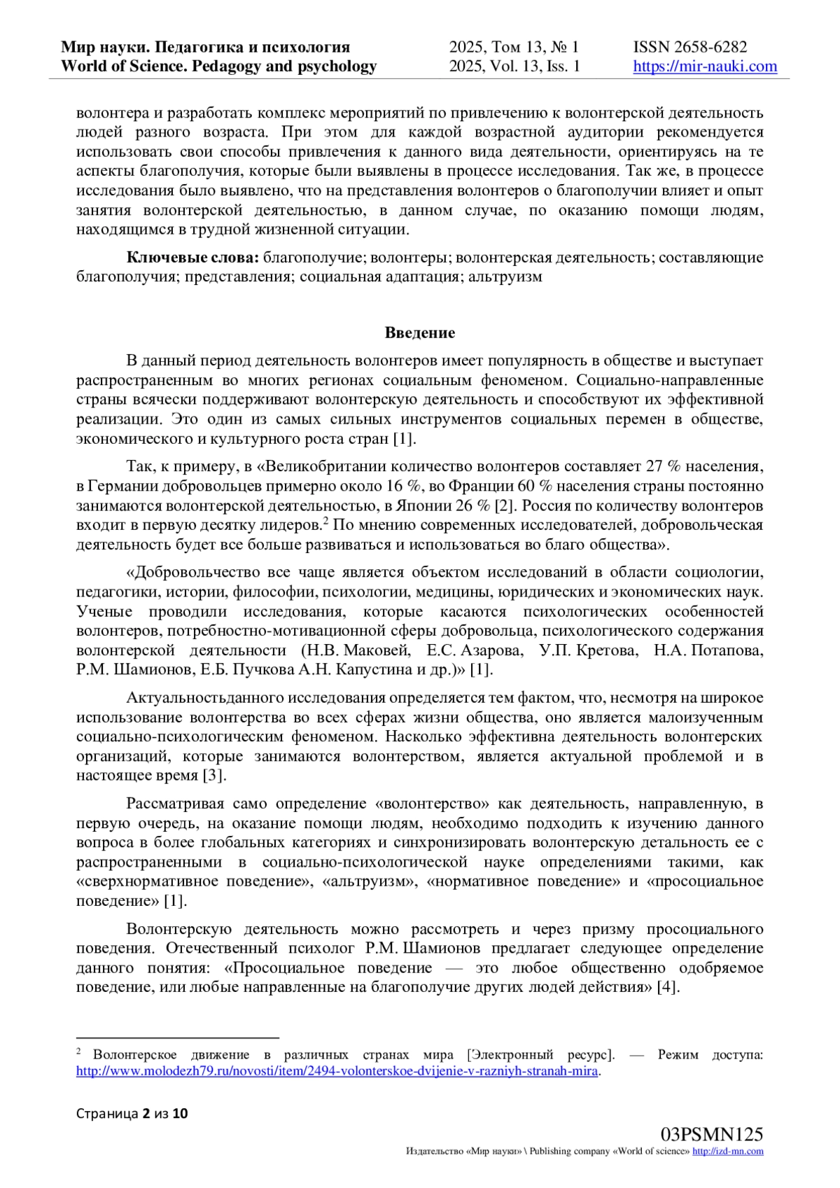 4. Азарова Е.С. Психологические детерминанты добровольческой деятельности / Е.С. Азарова, М.С. Яницкий // Вестник Томского государственного университета. - 2018. - № 306. - С. 120-125.