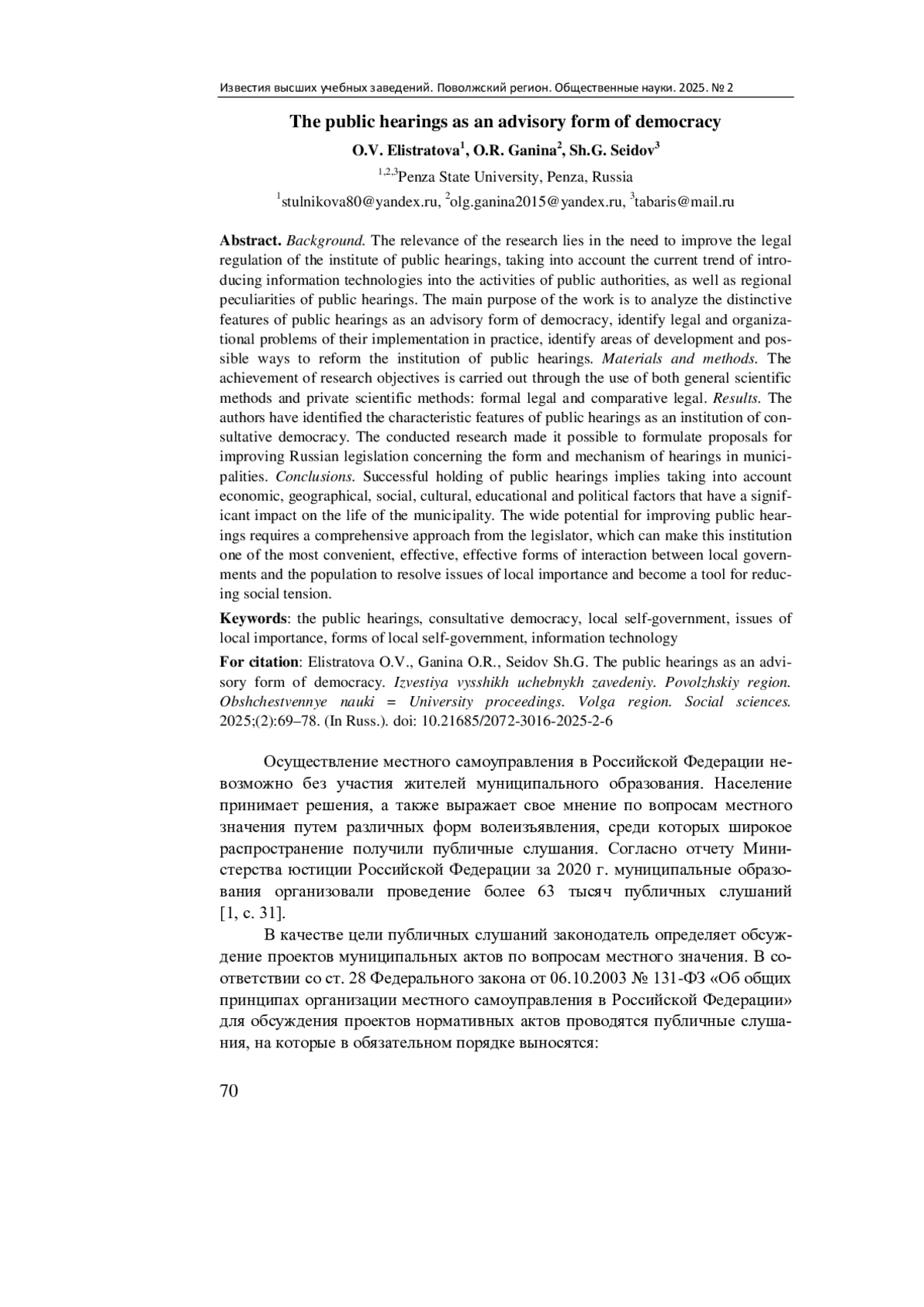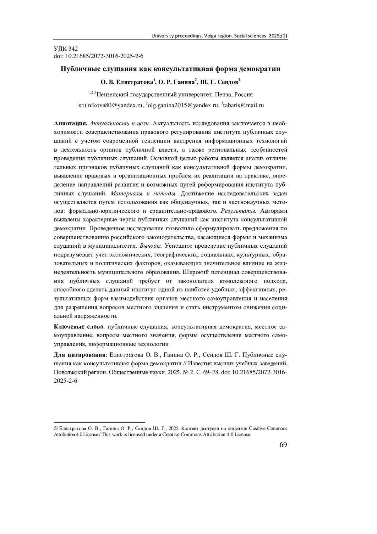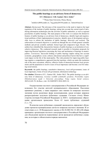 Результаты. Авторами выявлены характерные черты публичных слушаний как института консультативной демократии. Проведенное исследование позволило сформулировать предложения по совершенствованию российского законодательства, касающиеся формы и механизма слушаний в муниципалитетах.