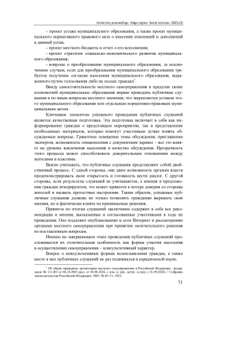 Осуществление местного самоуправления в Российской Федерации невозможно без участия жителей муниципального образования. Население принимает решения, а также выражает свое мнение по вопросам местного значения путем различных форм волеизъявления, среди которых широкое распространение получили публичные слушания. Согласно отчету Министерства юстиции Российской Федерации за 2020 г. муниципальные образования организовали проведение более 63 тысяч публичных слушаний [1, с. 31].