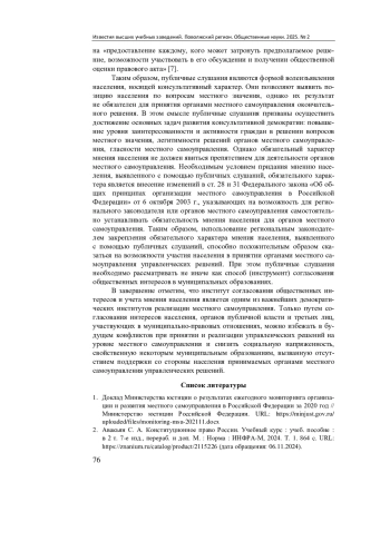 Выводы. Успешное проведение публичных слушаний подразумевает учет экономических, географических, социальных, культурных, образовательных и политических факторов, оказывающих значительное влияние на жизнедеятельность муниципального образования. Широкий потенциал совершенствования публичных слушаний требует от законодателя комплексного подхода, способного сделать данный институт одной из наиболее удобных, эффективных, результативных форм взаимодействия органов местного самоуправления и населения для разрешения вопросов местного значения и стать инструментом снижения социальной напряженности.