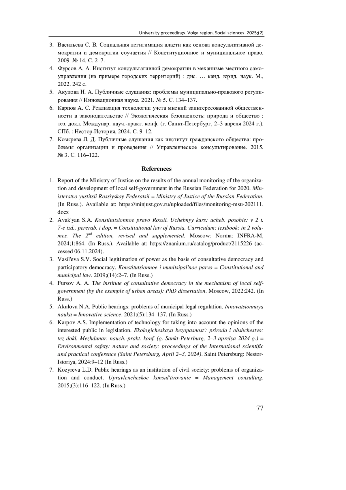 7. Козырева Л. Д. Публичные слушания как институт гражданского общества: проблемы организации и проведения // Управленческое консультирование. 2015. № 3. С. 116-122. EDN: TNGEHP