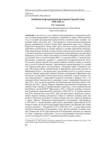 Материалы и методы. Работа подготовлена на основе монографий и статей о развитии Средней Азии со второй половины XIX в. до середины 1920-х гг. включительно. Использован статический материал и сравнительно-государствоведческий метод.