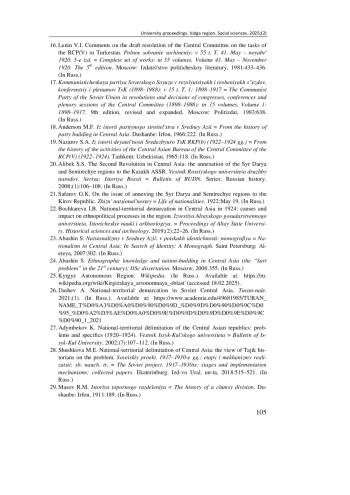 27. Адымбеков К. Национально-территориальное размежевание среднеазиатских республик: проблемы и специфика (1920-1924 гг.) // Вестник Иссык-Кульского университета. 2002. № 7. С. 107-112.