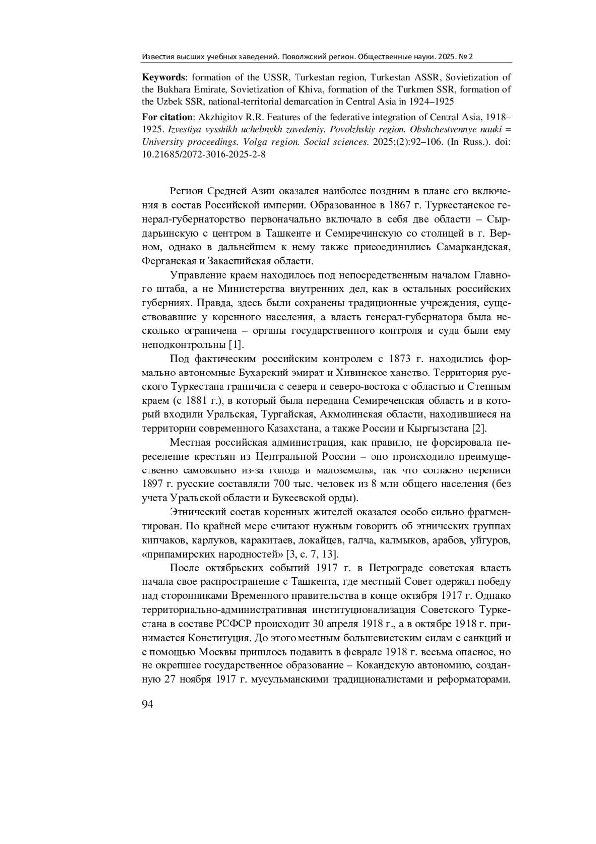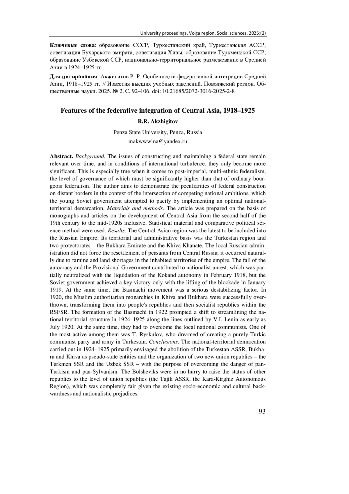 20. Алибек С. С. “Вторая революция в Средней Азии”: присоединение Сыр-Дарьинской и Семиречинской областей к Казахской АСССР // Вестник Российского университета дружбы народов. Серия: История России. 2008. № 1. С. 106-108. EDN: IJVZDX