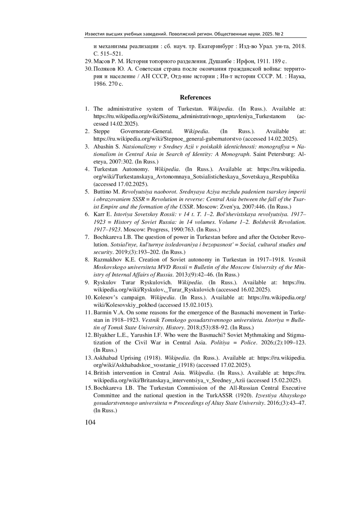 15. Бочкарева И. Б. Туркестанская комиссия ВЦИК и национальный вопрос в ТуркАССР (1920 г.) // Известия Алтайского государственного университета. 2016. № 3. С. 43-47. EDN: WBPAMJ