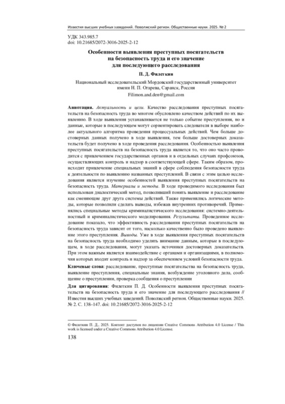 Результаты. Проведенное исследование показало, что эффективность расследования преступных посягательств на безопасность труда зависит от того, насколько качественно было проведено выявление этого преступления.
