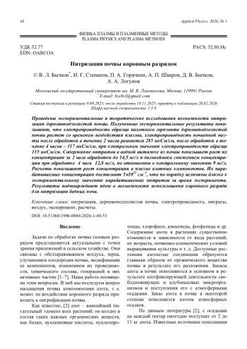 Нитризация почвы коронным разрядом Бычков В. Л., Степанов И. Г., Горячкин П. А., Шваров А. П., Бычков Д. В., Логунов А. А. 48