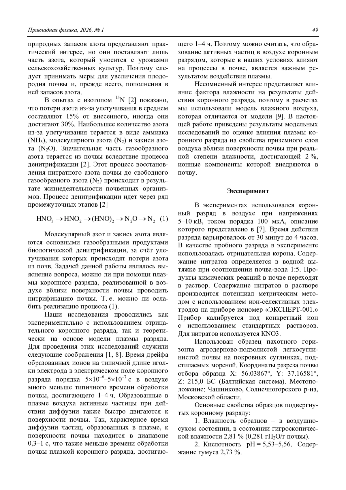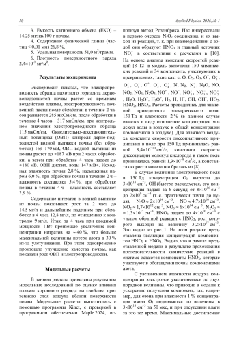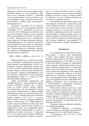 Полученные экспериментальные результаты показывают, что электропроводность образца пахотного горизонта дерновоподзолистой почвы растет со временем воздействия плазмы, электропроводность почвенной пасты после обработки в течение 2 часов равняется 285 мкСм/см, после обработки в течение 4 часов – 317 мкСм/см, при контрольном значении электропроводности образца 115 мкСм/см. Окислительно-восстановительный потенциал водной вытяжки из почвы растет до +187 мВ при 2 часах обработки, а затем при обработке 4 часа падает до +180 мВ. Это показывает, что происходит улучшение качества почвы. Содержание нитратов в водной вытяжке из почвы показывает рост за 2 часа до 14,5 мг/л и дальнейшее падение при обработке за 4 часа до 12,8 мг/л по отношению к контролю 9 мг/л. Последний результат показывает, что действие маломощного коронного разряда приводит к положительному воздействию на свойства приповерхностных слоев почвы. При этом содержание нитратов растет в среднем на 50 %. Проведенные расчеты показывают рост концентрации в плазме азотных компонентов, которые поступают в почву. Их нарабатываемые концентрации достигают 51021 см−3, что по порядку величины близко к экспериментальному значению нарабатываемых нитратов за время эксперимента. Полученные результаты подтверждает идею о возможности использования коронного разряда для нитризации бедных почв. Поэтому использование коронного разряда можно рекомендовать в качестве средства для активации почв в местах рискованной жизнедеятельности человека.