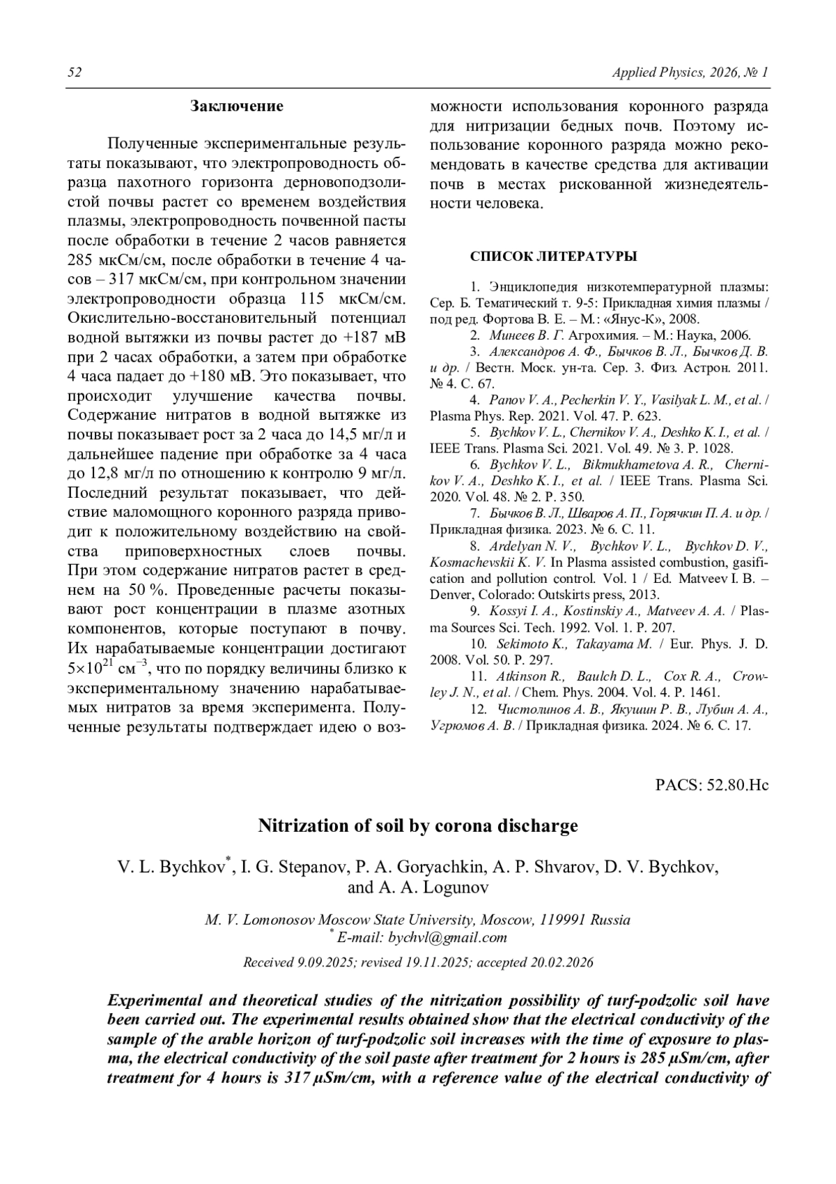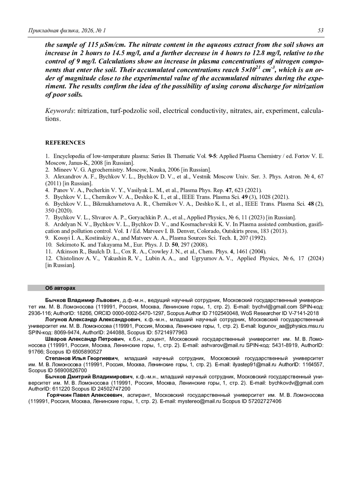 Nitrization of soil by corona discharge Bychkov V. L., Stepanov I. G., Goryachkin P. A., Shvarov A. P., Bychkov D. V., and Logunov A. A. 48