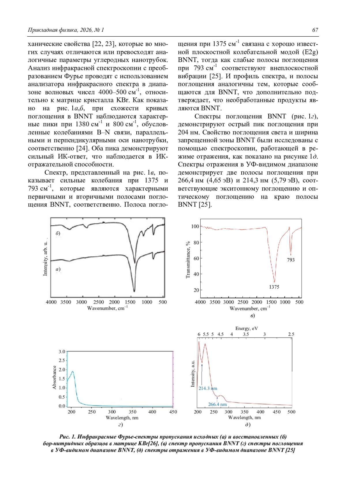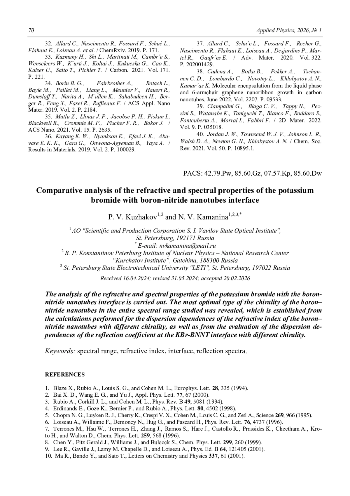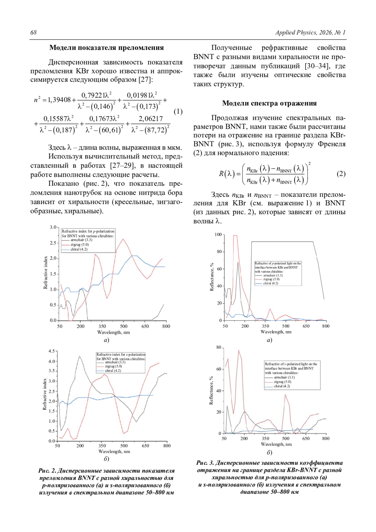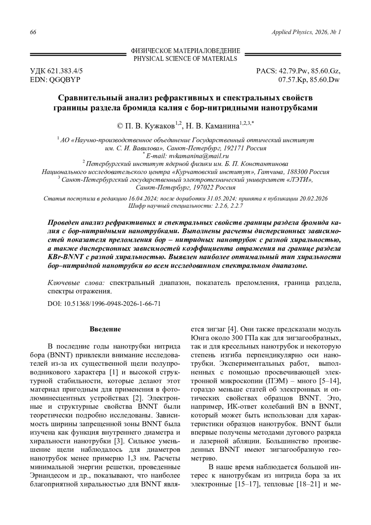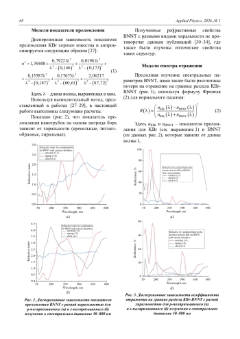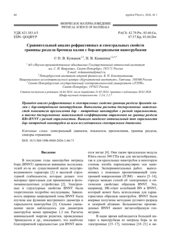 Comparative analysis of the refractive and spectral properties of the potassium bromide with boron-nitride nanotubes interface Kuzhakov P. V. and Kamanina N. V. 66