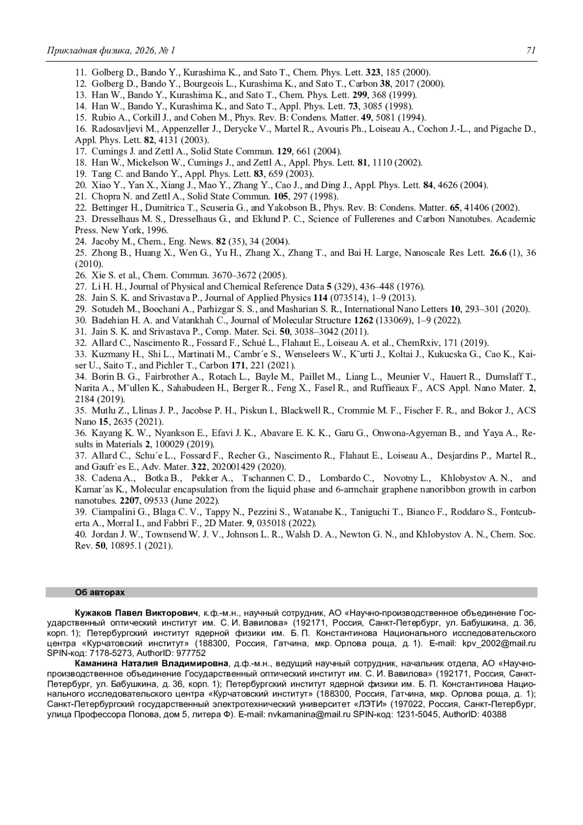 37. Allard C., Schu´e L., Fossard F., Recher G., Nascimento R., Flahaut E., Loiseau A., Desjardins P., Martel R., Gaufr`es E. / Adv. Mater. 2020. Vol. 322.