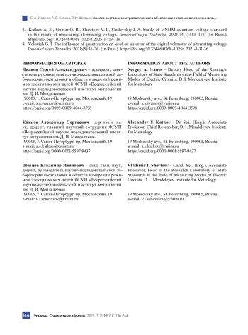 4. Гуревич М. Л., Шевцов В. И. Российские электротепловые и диодно-детекторные технологии для прецизионных измерителей переменных напряжений // Законодательная и прикладная метрология. 2018. № 3. С. 30-37.