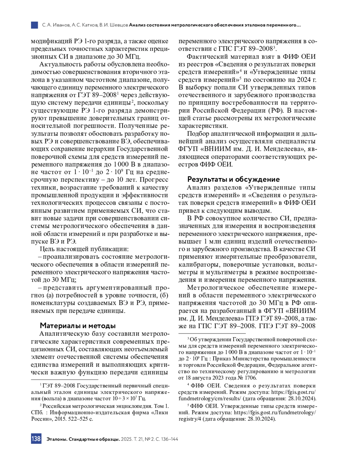 5. Телитченко Г. П., Шевцов В. И. Эталонная база России в области измерений переменного электрического напряжения // Измерительная техника. 2007. № 11. С. 44-47.