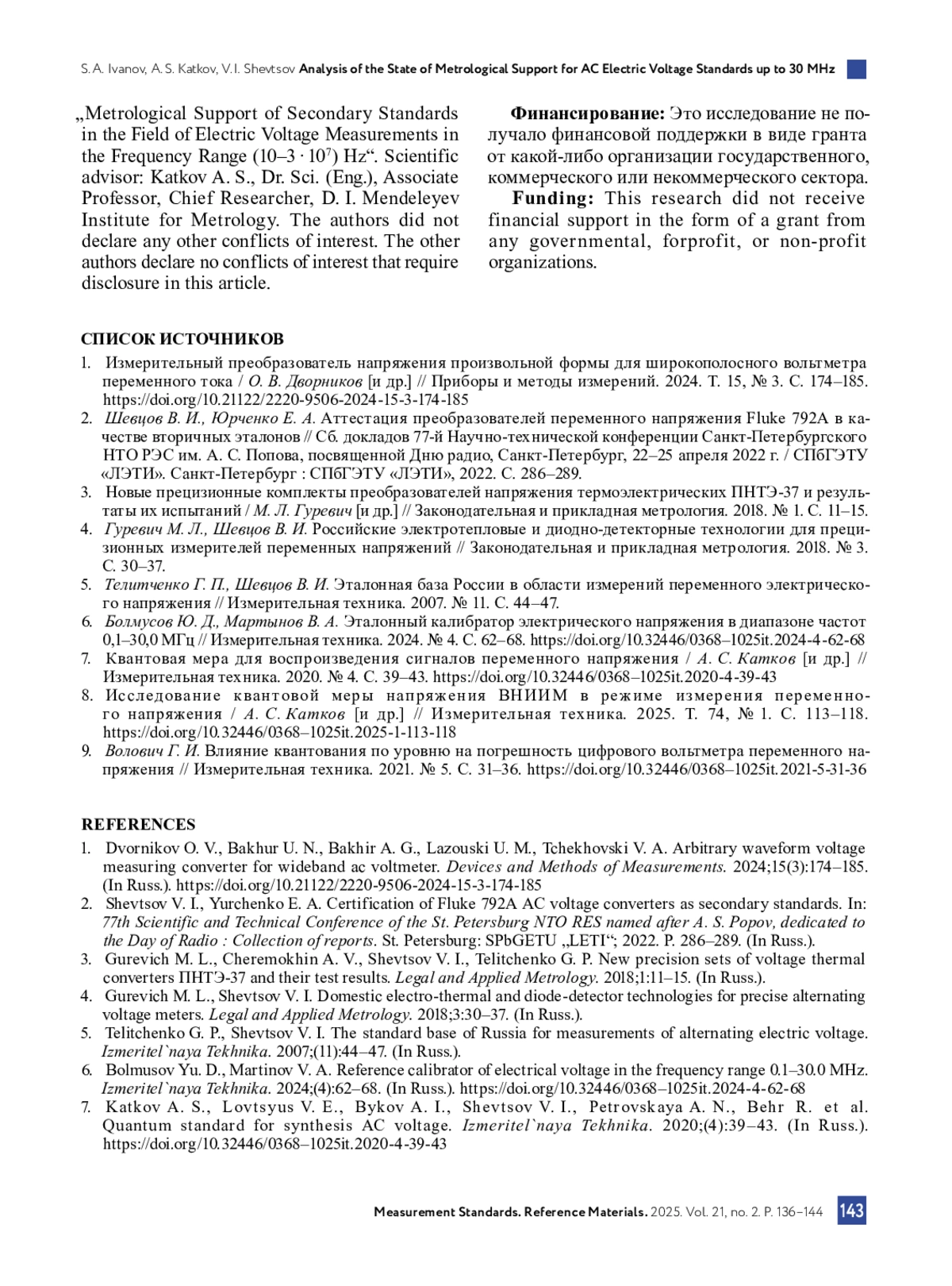 Shevtsov V. I., Yurchenko E. A. Certification of Fluke 792A AC voltage converters as secondary standards. In: 77th Scientific and Technical Conference of the St. Petersburg NTO RES named after A. S. Popov, dedicated to the Day of Radio: Collection of reports. St. Petersburg: SPbGETU „LETI“; 2022. P. 286-289. (In Russ.).