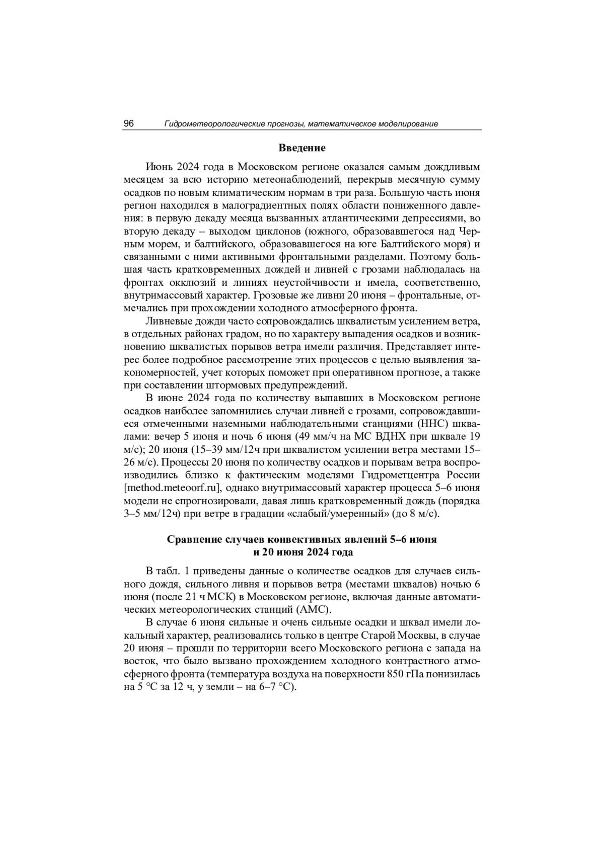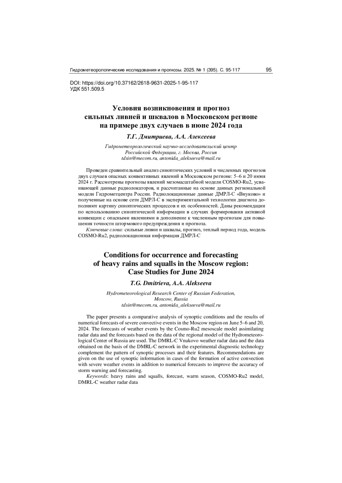 8. Алексеева А.А., Лосев В.М. Прогноз сильных летних осадков на основе выходных данных региональной модели Гидрометцентра России // Труды Гидрометцентра России. 2014. Вып. 351. С. 43-63.