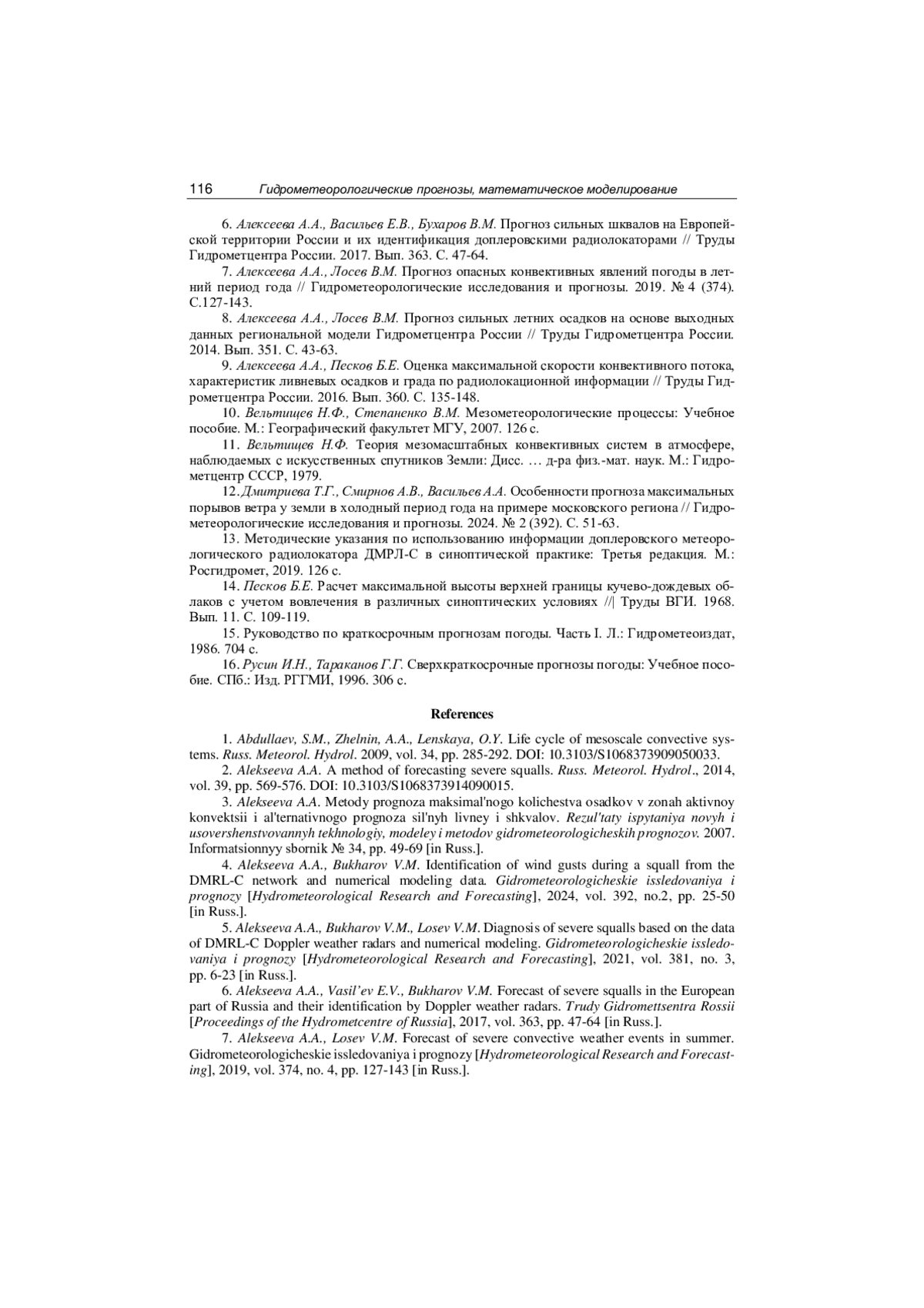 6. Алексеева А.А., Васильев Е.В., Бухаров В.М. Прогноз сильных шквалов на Европейской территории России и их идентификация доплеровскими радиолокаторами // Труды Гидрометцентра России. 2017. Вып. 363. С. 47-64.