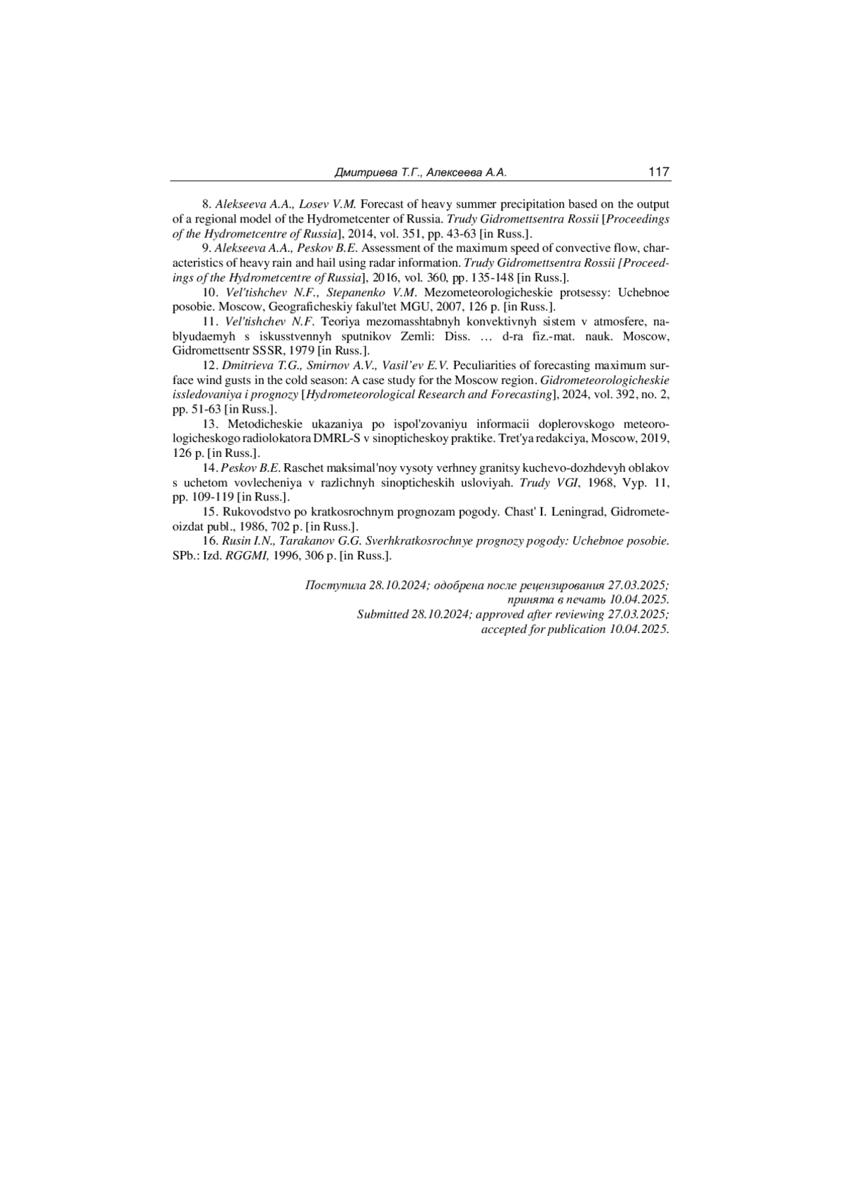 12. Дмитриева Т.Г., Смирнов А.В., Васильев А.А. Особенности прогноза максимальных порывов ветра у земли в холодный период года на примере московского региона // Гидрометеорологические исследования и прогнозы. 2024. № 2 (392). С. 51-63. EDN: XZFPXJ