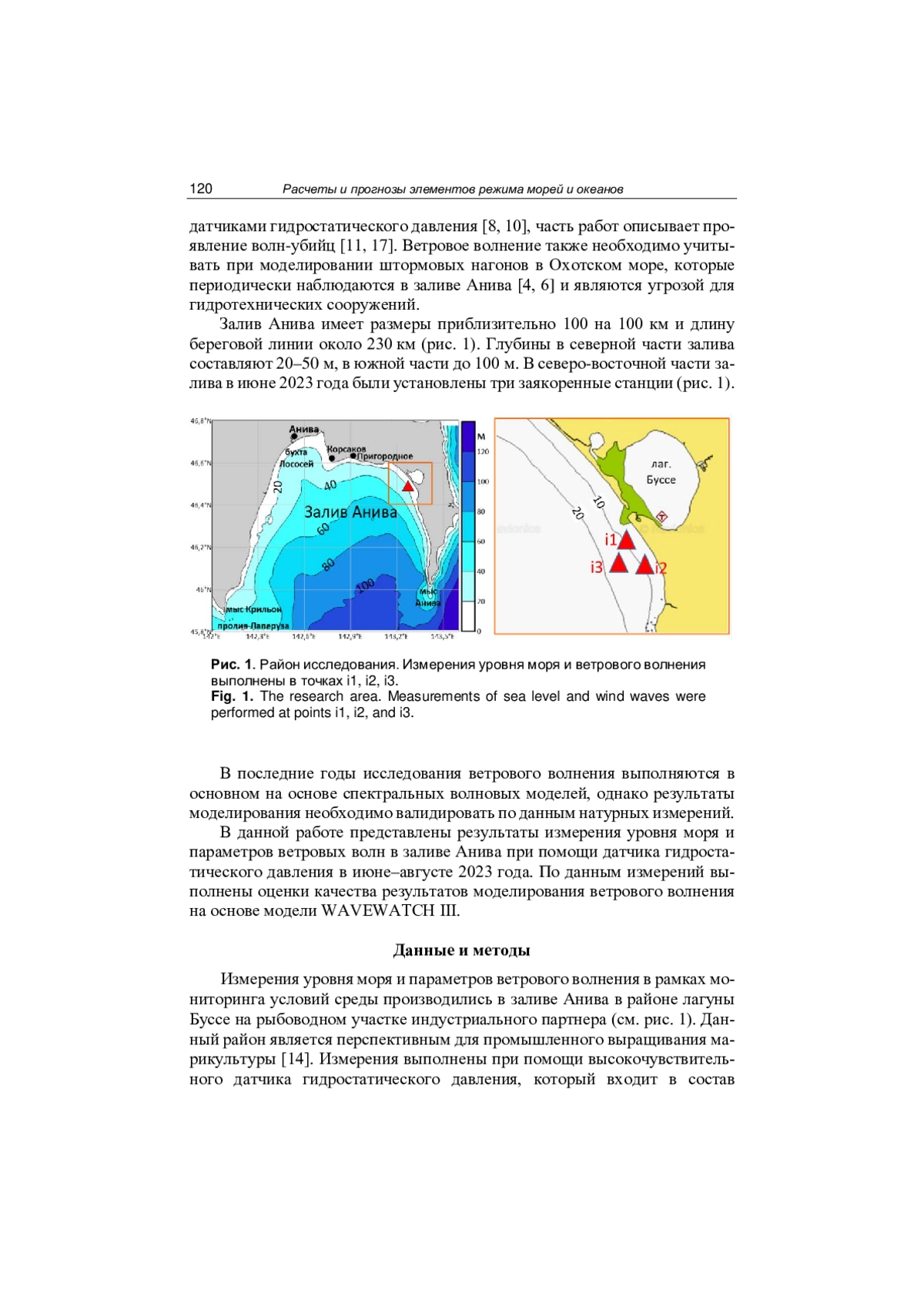 Представлен анализ измерений уровня моря и параметров ветрового волнения в заливе Анива, выполненных при помощи датчиков гидростатического давления в июне-августе 2023 года на заякоренных станциях на глубинах 10 и 15 м. Данные гидростатического давления при анализе ветровых волн корректировались с учетом теории линейного затухания колебаний с глубиной. Общий размах колебаний уровня моря составил 1.63 м в сизигию и 0.3 м в квадратуру. Максимальная высота значительных волн составила 1.73 м, а максимальная высота индивидуальной волны - 2.82 м. Обнаружено присутствие аномальных волн с индексом аномальности более 2. При сопоставлении высоты волн по результатам моделирования с данными измерений получено, что коэффициент корреляции составляет 0.84, а среднеквадратическая ошибка 0.17 м.
