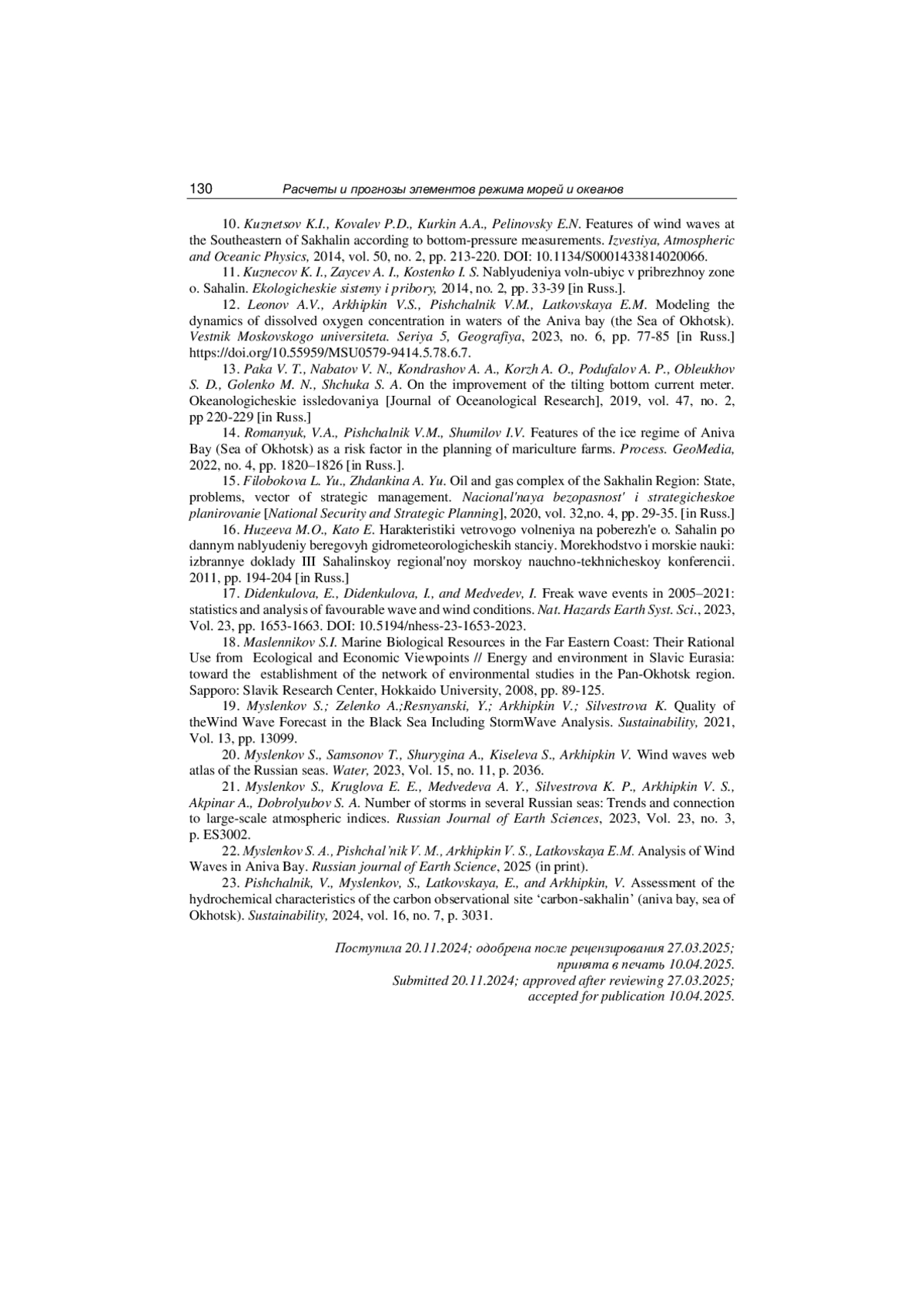 22. Myslenkov S. А., Pishchal’nik V. M., Arkhipkin V. S., Latkovskaya E.M. Analysis of Wind Waves in Aniva Bay // Russian journal of Earth Science, 2025 (in print). EDN: KTQGSC
