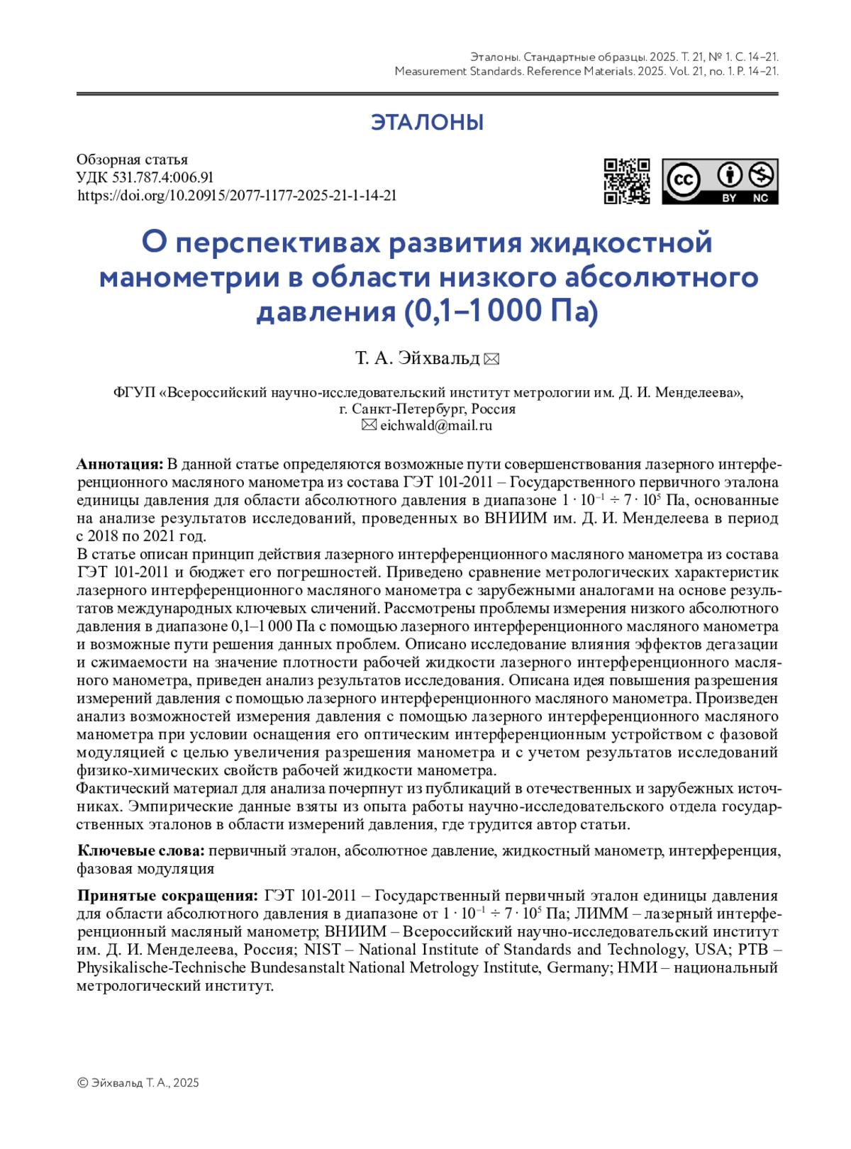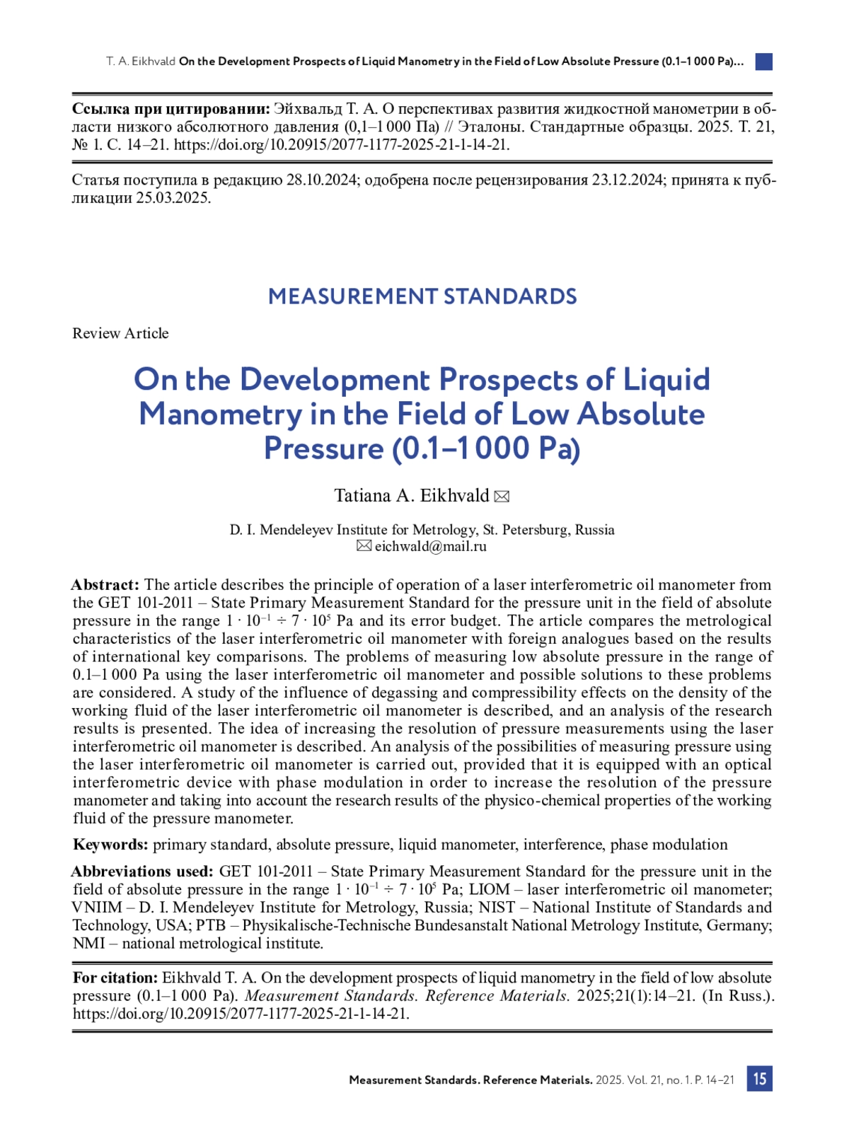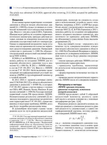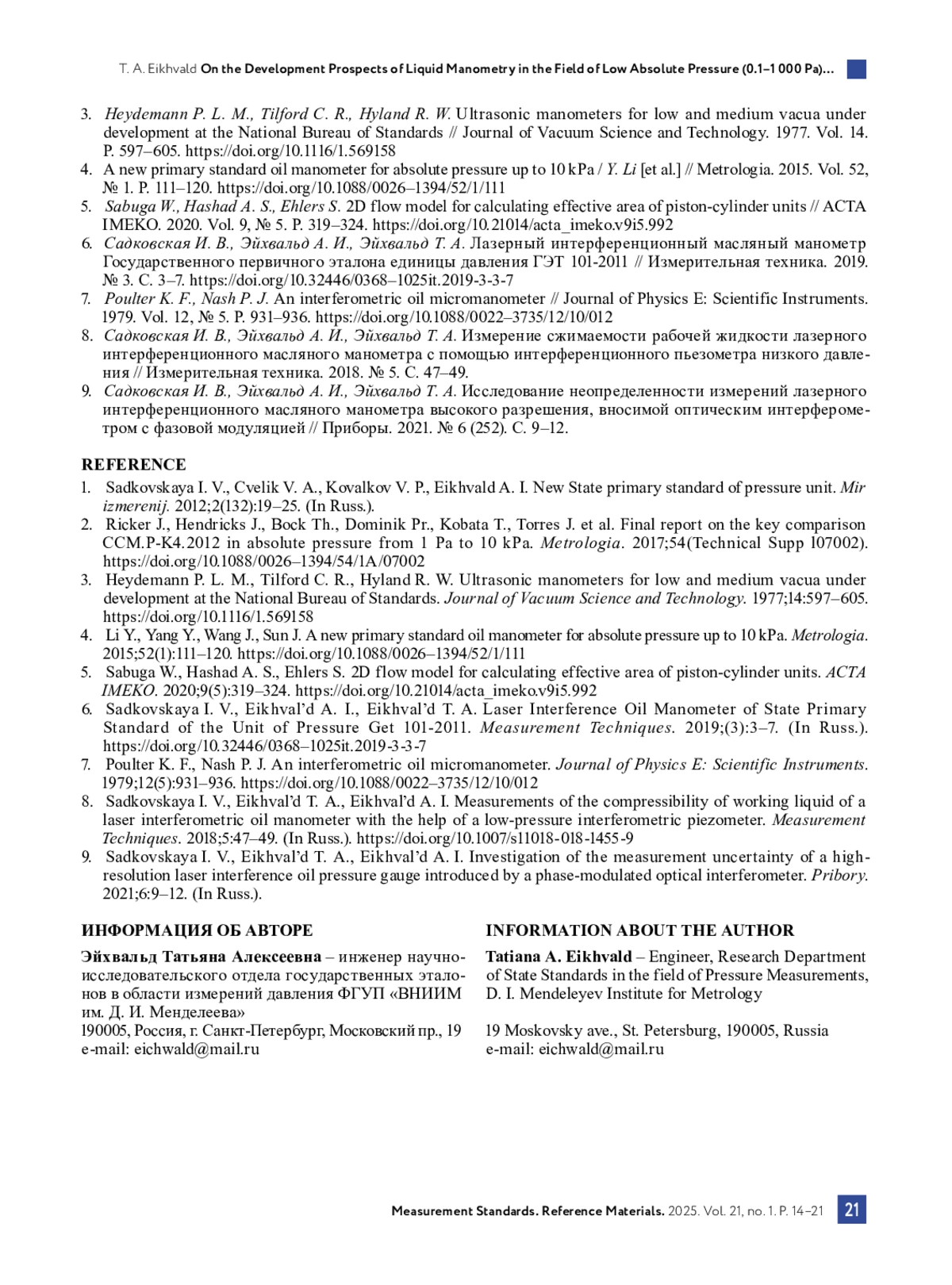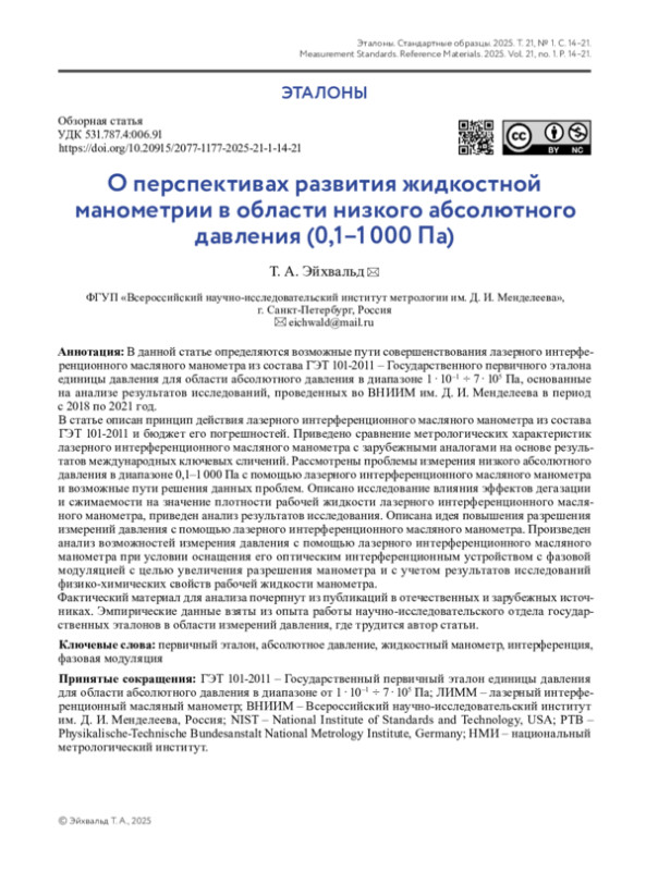 6. Садковская И. В., Эйхвальд А. И., Эйхвальд Т. А. Лазерный интерференционный масляный манометр Государственного первичного эталона единицы давления ГЭТ 101-2011 // Измерительная техника. 2019. № 3. С. 3-7. DOI: 10.32446/0368-1025it.2019-3-3-7