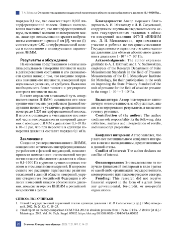 8. Садковская И. В., Эйхвальд А. И., Эйхвальд Т. А. Измерение сжимаемости рабочей жидкости лазерного интерференционного масляного манометра с помощью интерференционного пьезометра низкого давления // Измерительная техника. 2018. № 5. С. 47-49.