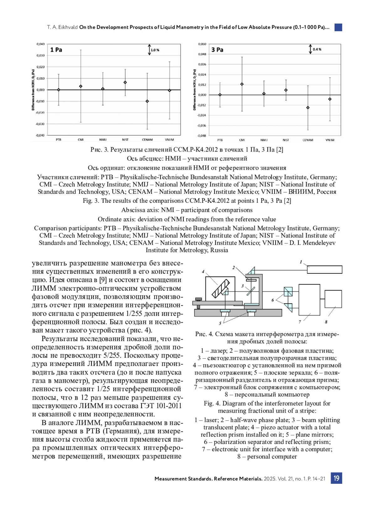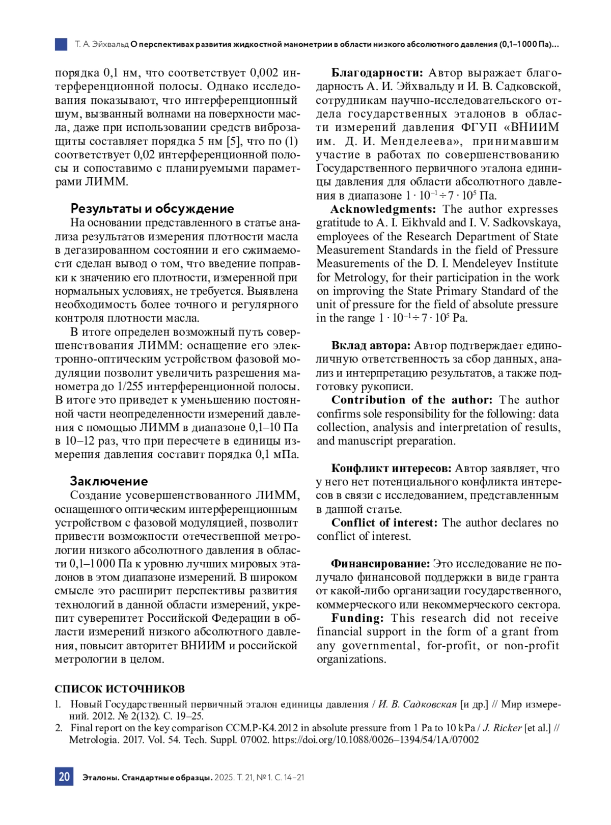 2. Final report on the key comparison CCM.P-K4.2012 in absolute pressure from 1 Pa to 10 kPa / J. Ricker [et al.] // Metrologia. 2017. Vol. 54. Tech. Suppl. 07002. DOI: 10.1088/0026-1394/54/1A/07002