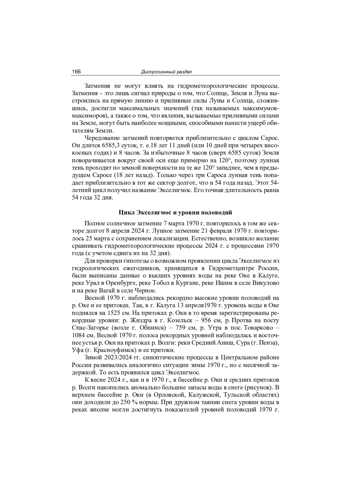 Катастрофические половодья на реках Урала и Западной Сибири весной 2024 г. ‒ явление случайное только на первый взгляд. В [3] описана синхронизация повторяемости опасных метеорологических и агрометеорологических явлений с циклами лунно-солнечных затмений.
