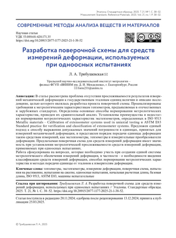 В статье рассмотрена проблема отсутствия прослеживаемости результатов измерений механической деформации к государственным эталонам единиц величин и описано исследование, целью которого являлась разработка проекта поверочной схемы. Проанализированы требования к метрологическим характеристикам тензометров, предъявляемые в отечественных и зарубежных стандартах. Определены основные способы нормирования метрологических характеристик, проведен их сравнительный анализ. Установлены преимущества и недостатки нормирования метрологических характеристик экстензометров, определенных в ISO 9513 Metallic materials – Calibration of extensometer systems used in uniaxial testing и ASTM E 83 Standard practice for verification and classification of extensometer systems. Предложен единый подход к способу выражения допускаемых значений погрешности в единицах, принятых для измерений механической деформации, и представлен порядок передачи единицы деформации таким средствам измерений, как экстензометры, тензометры и измерительные преобразователи деформации. Предлагаемая поверочная схема для средств измерений деформации имеет значимость при установлении метрологической прослеживаемости средств измерений деформации, применяемых при одноосных испытаниях.