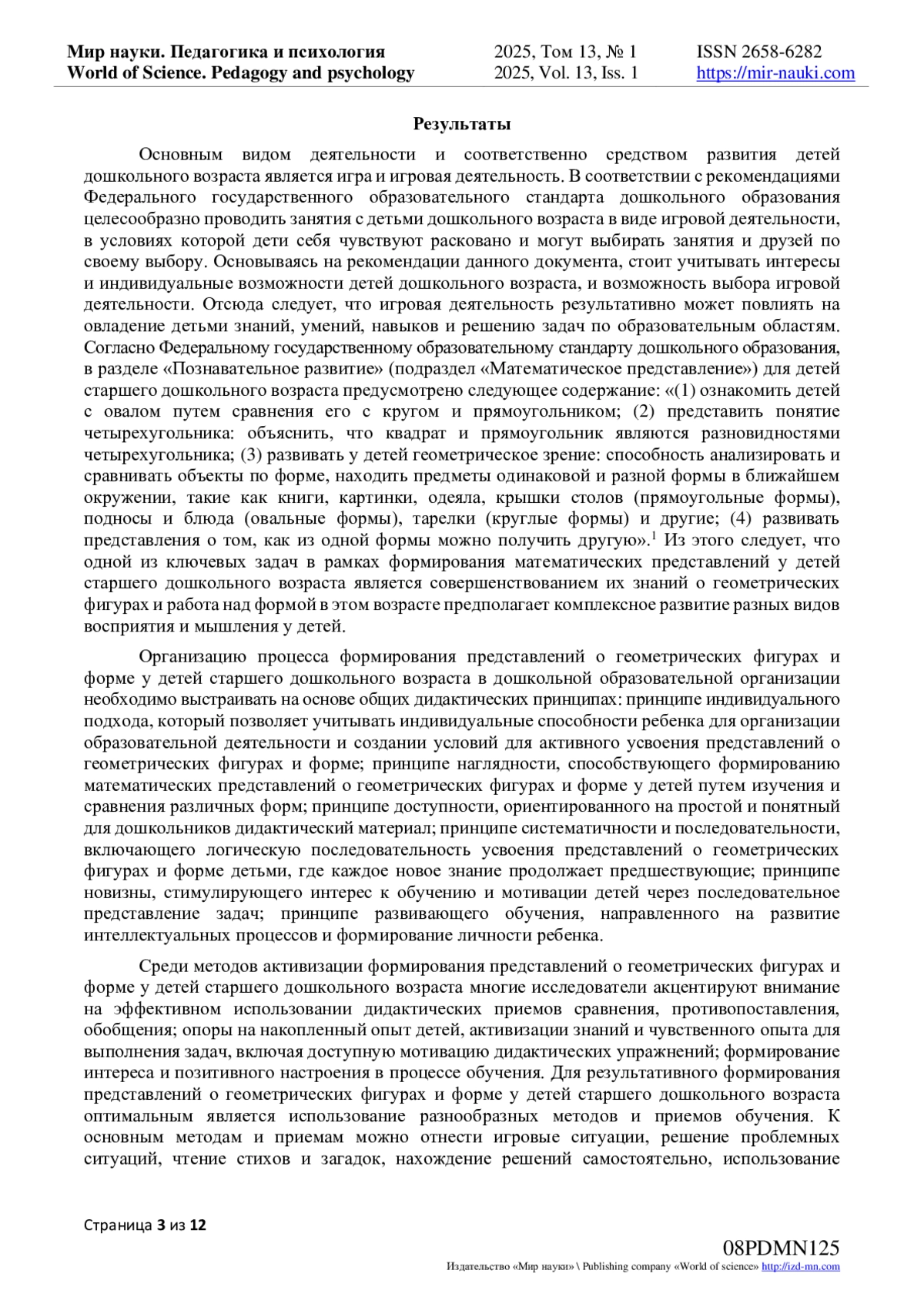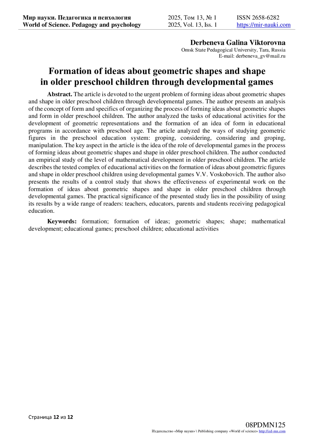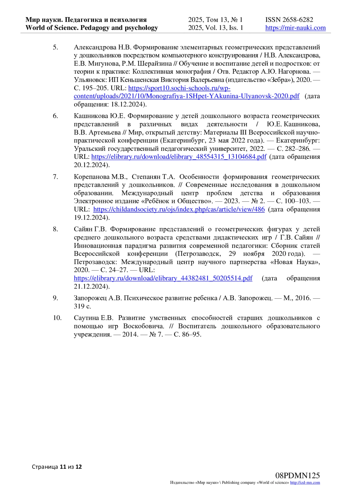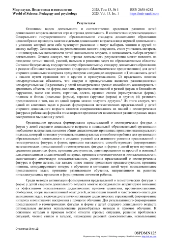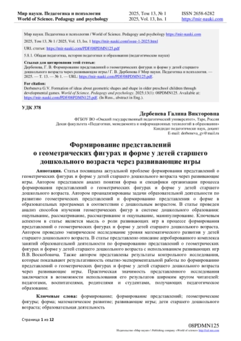 8. Сайян Г.В. Формирование представлений о геометрических фигурах у детей среднего дошкольного возраста средствами дидактических игр / Г.В. Сайян // Инновационная парадигма развития современной педагогики: Сборник статей Всероссийской конференции (Петрозаводск, 29 ноября 2020 года). - Петрозаводск: Международный центр научного партнерства “Новая Наука”, 2020. - С. 24-27. - URL: download/elibrary_44382481_50205514.pdf (дата обращения 21.12.2024). EDN: CCGUKP