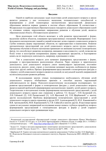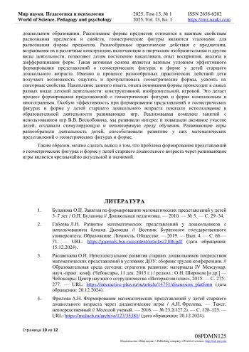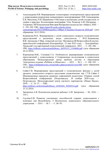 7. Корепанова М.В., Степанян Т.А. Особенности формирования геометрических представлений у дошкольников. // Современные исследования в дошкольном образовании. Международный центр проблем детства и образования Электронное издание “Ребёнок и Общество”. - 2023. - № 2. - С. 100-103. - URL: https://childandsociety.ru/ojs/index.php/cas/article/view/486 (дата обращения 19.12.2024).