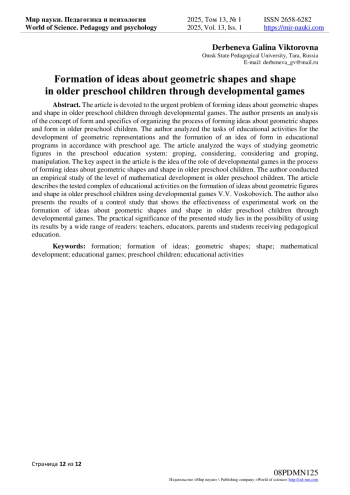 Статья посвящена актуальной проблеме формирования представлений о геометрических фигурах и форме у детей старшего дошкольного возраста через развивающие игры. Автором представлен анализ понятия форма и специфики организации процесса формирования представлений о геометрических фигурах и форме у детей старшего дошкольного возраста. Автором проанализированы задачи образовательной деятельности по развитию геометрических представлений и формированию представления о форме в образовательных программах в соответствии с дошкольным возрастом. В статье проведен анализ способов изучения геометрических фигур в системе дошкольного образования: ощупывание, рассматривание, рассматривание и ощупывание, манипулирование. Ключевым аспектом в статье является мысль о роли развивающих игр в процессе формирования представлений о геометрических фигурах и форме у детей старшего дошкольного возраста. Автором проведено эмпирическое исследование уровня математического развития у детей старшего дошкольного возраста. В статье представлено описание апробированного комплекса занятий образовательной деятельности по формированию представлений о геометрических фигурах и форме у детей старшего дошкольного возраста с использованием развивающих игр В. В. Воскобовича. Также автором представлены результаты контрольного исследования, которые показывают результативность опытно-экспериментальной работы по формированию представлений о геометрических фигурах и форме у детей старшего дошкольного возраста через развивающие игры. Практическая значимость представленного исследования заключается в возможности использования его результатов широким кругом читателей: педагогами, воспитателями, родителями и студентами, получающих педагогическое образование.