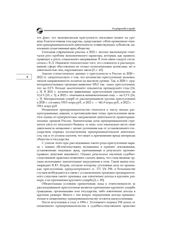 Одним из обязательных элементов государственного суверенитета является экономическая защищенность страны в целом и ее финансово-хозяйственной сферы в частности. Поэтому не вызывает сомнений тот факт, что экономическая преступность негативно влияет на уровень благосостояния государства, представляет собой проявление теневой предпринимательской деятельности хозяйствующих субъектов, наносящей существенный вред обществу. Учитывая современные реалии, в 2022 г. вполне закономерно отмечался рост проблем экономического характера, который, как правило, приводит к росту социального напряжения. В этой связи следует согласиться с В. Д. Ивановой относительно того, что сложности в рассматриваемой сфере обусловлены не только политическими аспектами, но и деятельностью лиц, нарушающих закон
